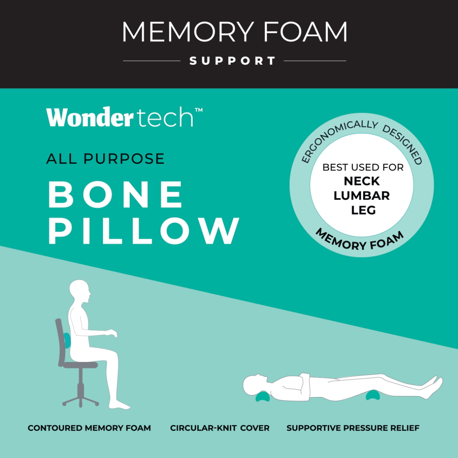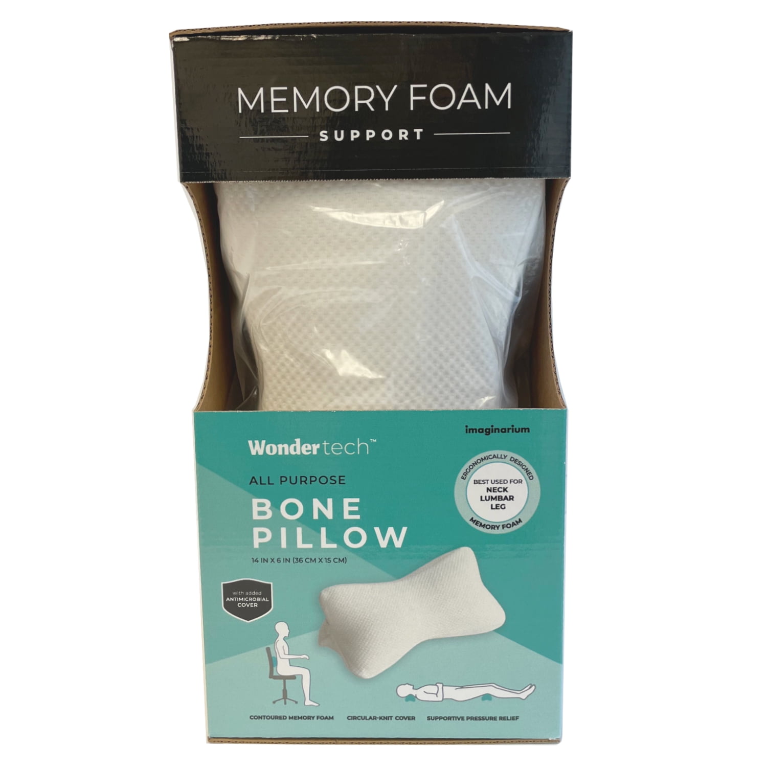 The Wondertech™ All-Purpose Memory Foam Bone Pillow is the perfect solution for neck, lumbar and leg support to help relieve pressure. With anti-microbial product protection, the bone pillow features our ultra-plush contoured support memory foam. The soft, circular knit cover is removeable for machine washing and includes an elastic strap that can be attached to your chair while working or on your suitcase when on-the-move.