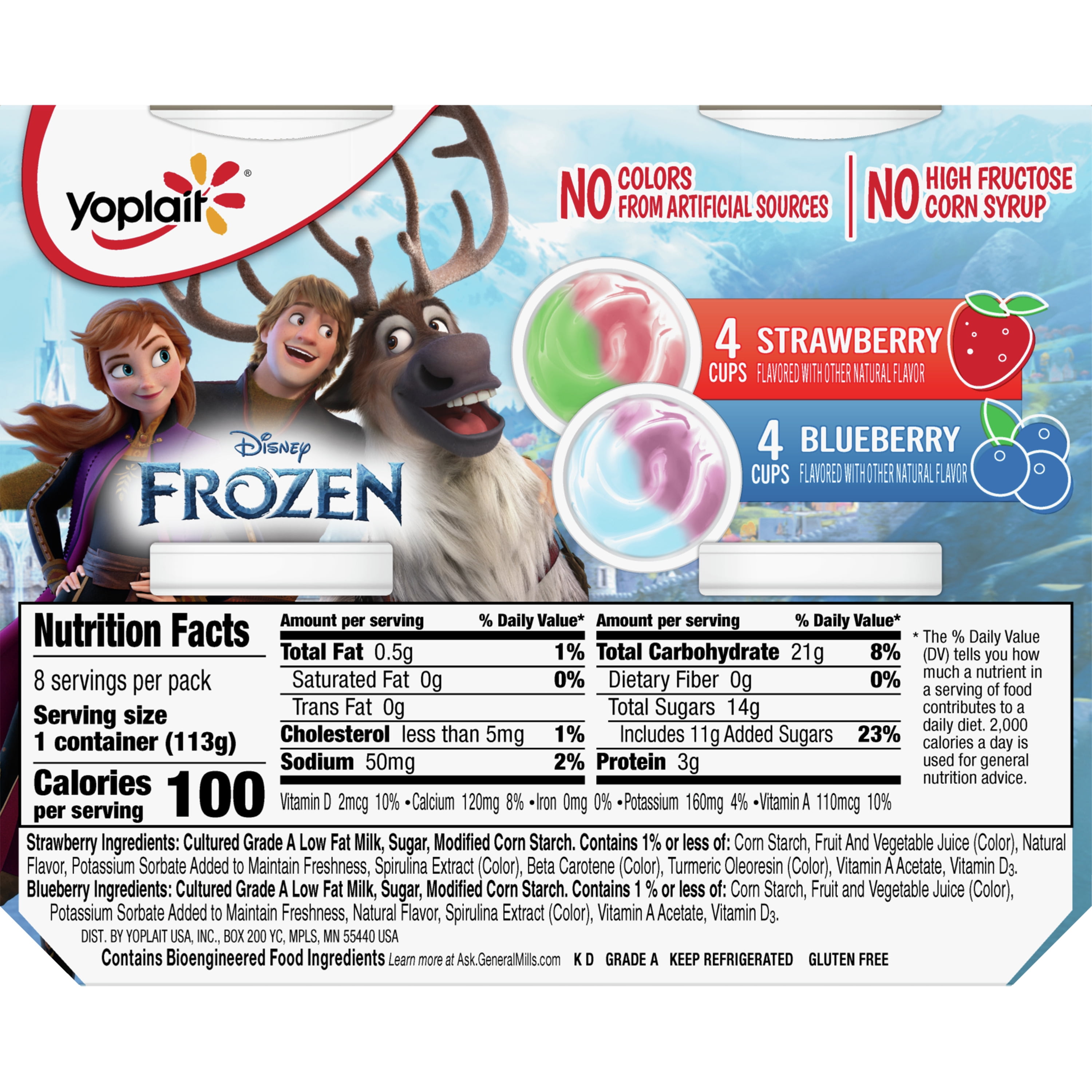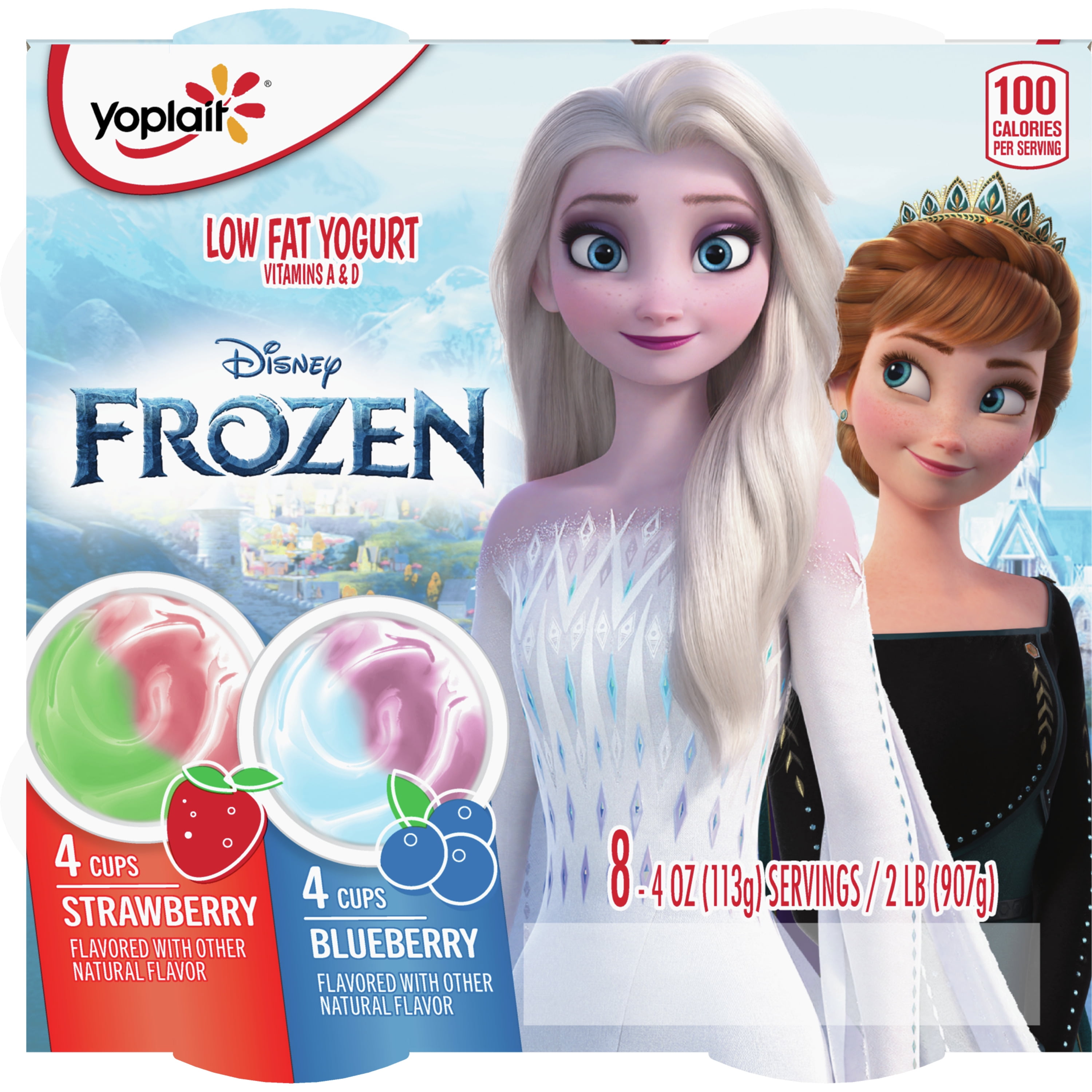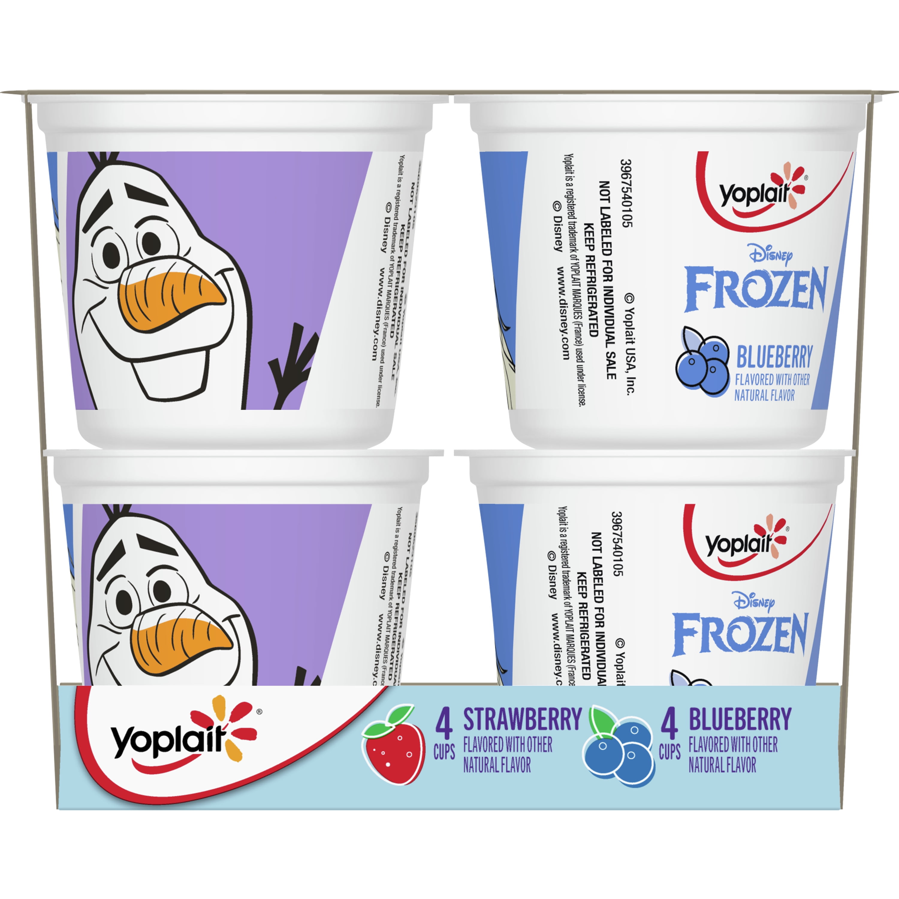 - Eight pack of 4 oz yogurt cups of Yoplait Frozen Strawberry and Blueberry Kids Yogurt