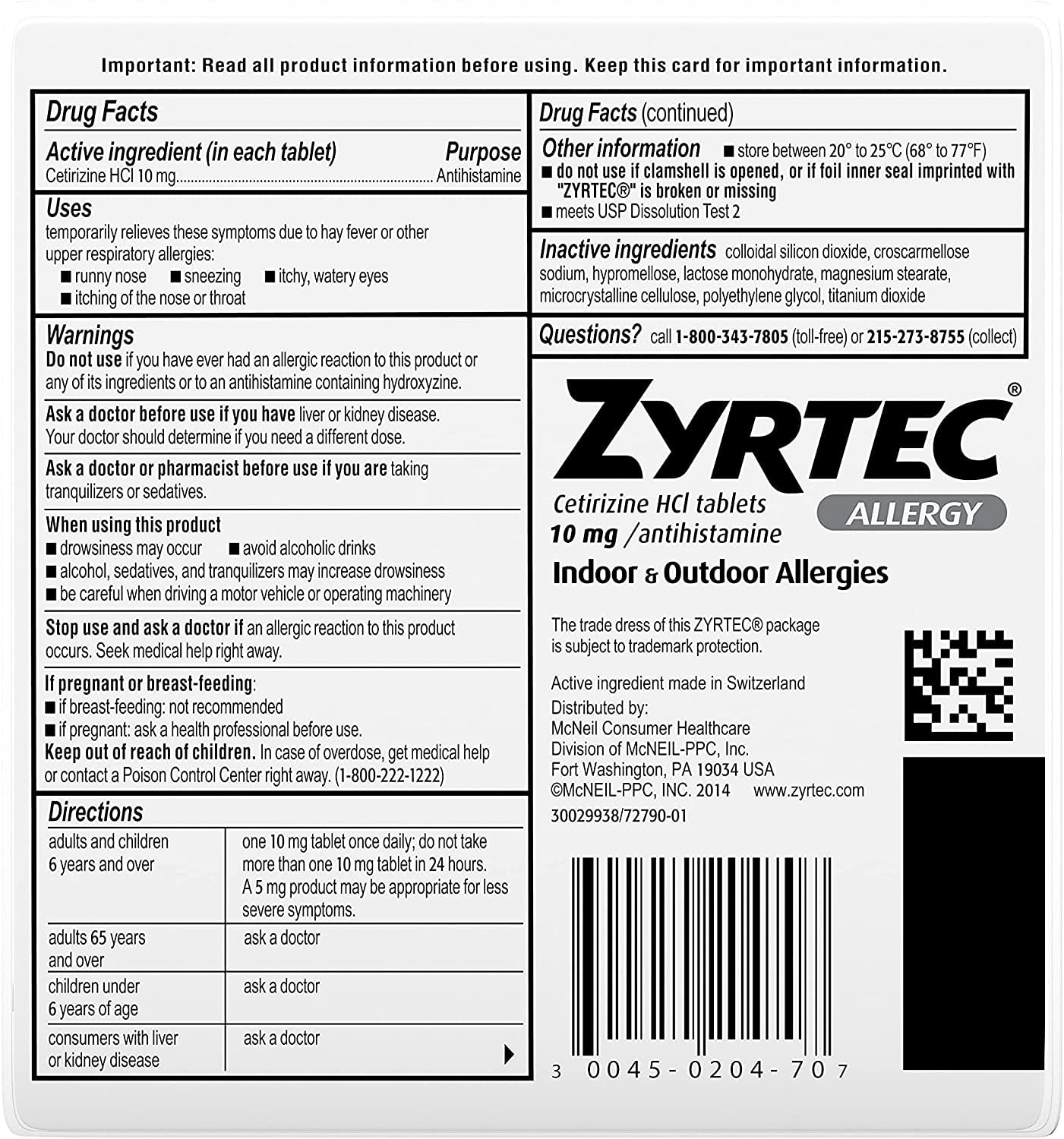 AntihistamineJ & JActive Ingredients:In Each Tablet: Cetirizine HCI 10 mgAdults and children 6 years and over: One 10 mg tablet once daily; do not take more than one 10 mg tablet in 24 hours. A 5 mg product may be appropriate for less severe symptoms. Adults 65 years and over: Ask a doctor. Children under 6 years of age: Ask a doctor. Consumer with liver or kidney disease: Ask a doctor.Inactive Ingredients:Carnauba Wax; Corn Starch; Hypromellose; Lactose Monohydrate; Magnesium Stearate; Polyethylene Glycol; Povidone; Titanium DioxideUses:Temporarily relieves these symptoms due to hay fever or other upper respiratory allergies: runny nose; sneezing; itchy, watery eyes; itching of the nose or throat. Indoor and outdoor allergies.Do not use if you have ever had an allergic reaction to this product or any of its ingredients or to an antihistamine containing hydroxyzine. Ask a doctor before use if you have liver or kidney disease. Your doctor should determine if you need a different dose. Ask a doctor or pharmacist before use if you are taking tranquilizers or sedatives. When using this product: drowsiness may occur; avoid alcoholic drinks; alcohol, sedatives, and tranquilizers may increase drowsiness; be careful when driving a motor vehicle or operating machinery. Stop use and ask a doctor if an allergic reaction to this product occurs. Seek medical help right away. If pregnant or breast-feeding: If breast-feeding: not recommended; if pregnant: ask a health professional before use. Keep out of reach of children. In case of overdose, get medical help or contact a Poison Control Center right away. AntihistamineJ & JActive Ingredients:In Each Tablet: Cetirizine HCI 10 mgAdults and children 6 years and over: One 10 mg tablet once daily; do not take more than one 10 mg tablet in 24 hours. A 5 mg product may be appropriate for less severe symptoms. Adults 65 years and over: Ask a doctor. Children under 6 years of age: Ask a doctor. Consumer with liver or kidney disease: Ask a doctor.Inactive Ingredients:Carnauba Wax; Corn Starch; Hypromellose; Lactose Monohydrate; Magnesium Stearate; Polyethylene Glycol; Povidone; Titanium Dioxide Uses:Temporarily relieves these symptoms due to hay fever or other upper respiratory allergies: runny nose; sneezing; itchy, watery eyes; itching of the nose or throat. Indoor and outdoor allergies.Do not use if you have ever had an allergic reaction to this product or any of its ingredients or to an antihistamine containing hydroxyzine. Ask a doctor before use if you have liver or kidney disease. Your doctor should determine if you need a different dose. Ask a doctor or pharmacist before use if you are taking tranquilizers or sedatives. When using this product: drowsiness may occur; avoid alcoholic drinks; alcohol, sedatives, and tranquilizers may increase drowsiness; be careful when driving a motor vehicle or operating machinery. Stop use and ask a doctor if an allergic reaction to this product occurs. Seek medical help right away. If pregnant or breast-feeding: If breast-feeding: not recommended; if pregnant: ask a health professional before use. Keep out of reach of children. In case of overdose, get medical help or contact a Poison Control Center right away.