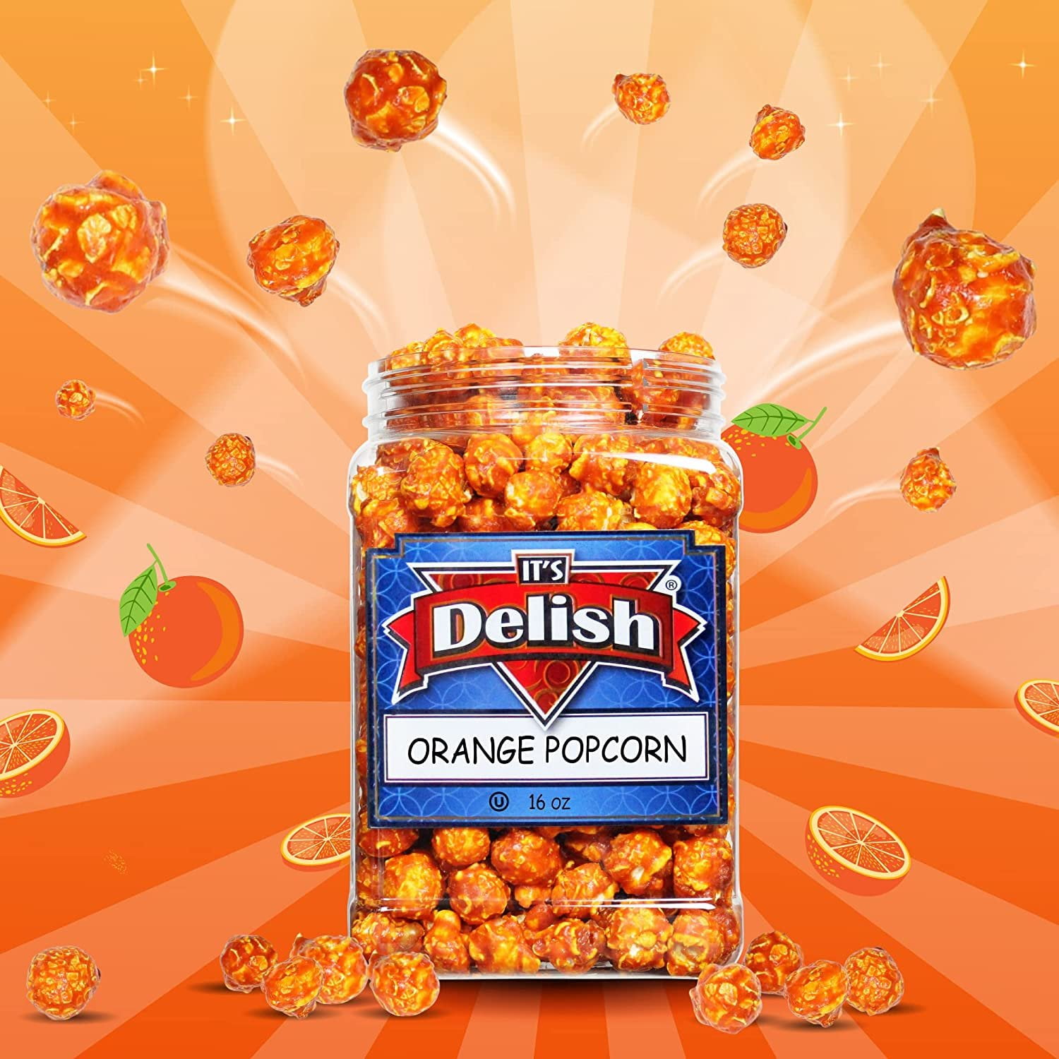 Gourmet Orange Flavored Popcorn by It’s Delish, 16 Oz Jumbo Container Bulk Air Popped Pop Corn Snack – Fruity Orange Themed Candy Confetti Birthday Party, Events Gluten Free, Vegan, Kosher