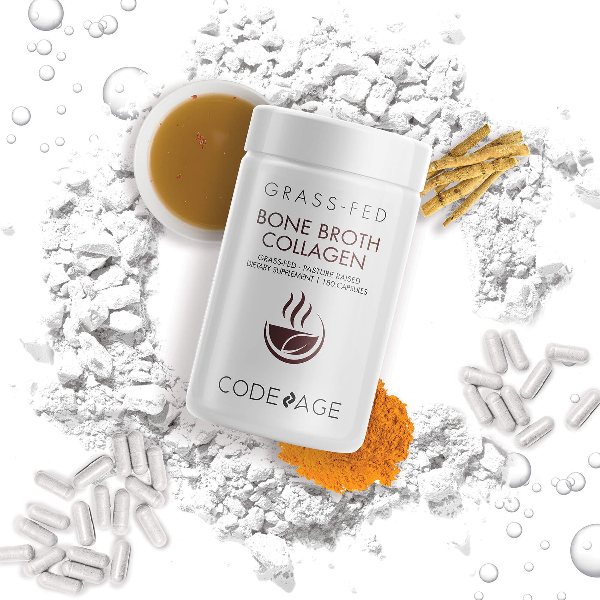 Codeage Grass-Fed Bone Broth Collagen Capsules Supplement, Type 1, 2, 3, Turmeric – 180 Count