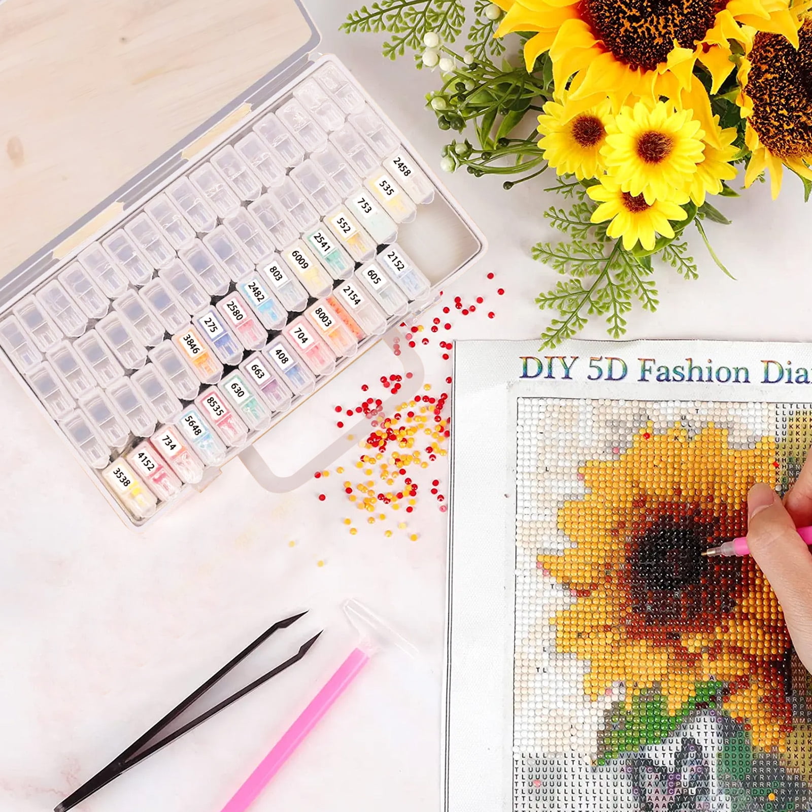 TSV is committed to providing products that are aesthetically designed, smartly manufactured, and easy enough for novices to experts. The diamond painting drill storage case has 64 slots, each slot is 1 x 0.4 x 2in. The clear and durable container has a clear, snap-shut lid, which is easy to quickly see all your items at a glance without opening the box. The embroidery beads organizer storage container is not just for diamonds but also ideal for storing nail art decorations, make-up, jewelry, beads, necklaces, rings, charms, glitter, tablets, pills, and other various items. The diamond painting drill container is removable, with a size 8.9 x 5 x 2in, you can bring it anywhere you like. Start your diamond painting with a TSV diamond painting drill storage box!