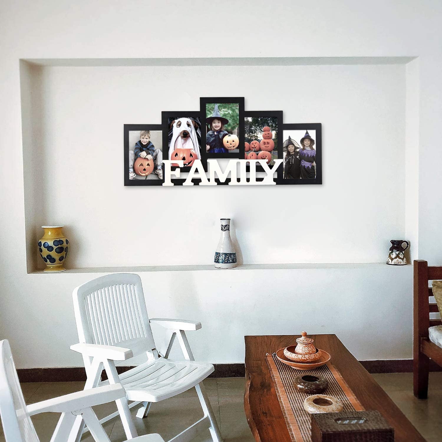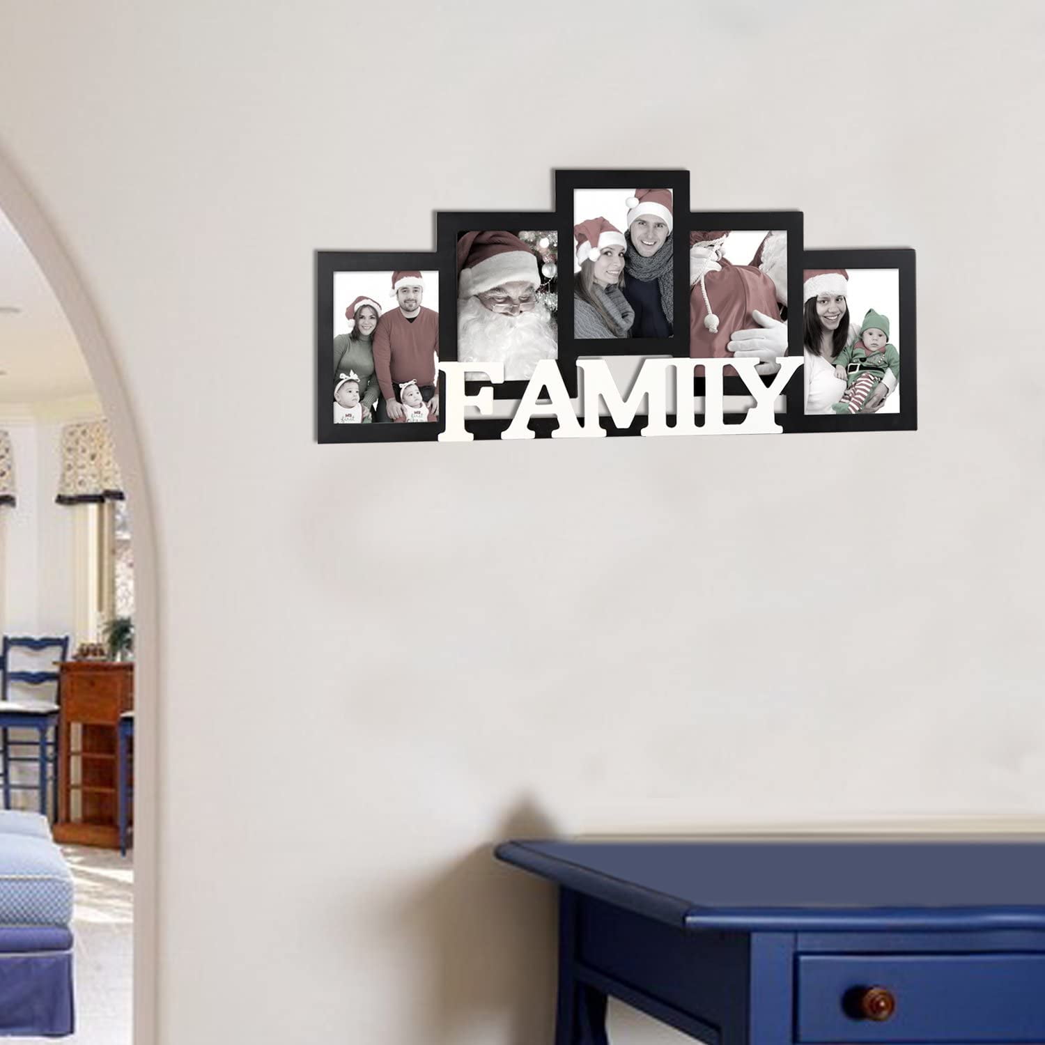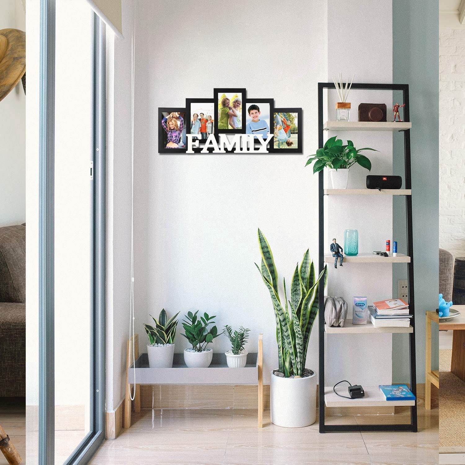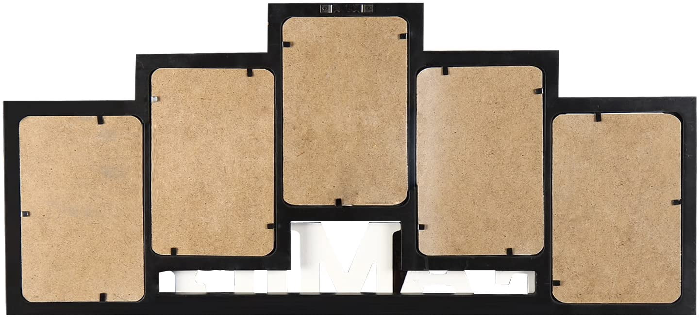 Features: -Finish: White matte. -Material: Wood and glass. -Cascading picture frame with block family lettering. -Simple to load, removable back panels with bending pins. -Home decor wall art. Color: -White matte. Frame Material: -Glass/Wood. Theme: -Family/Standard. Picture Size: -4" x 6". Picture Capacity: -5. Frame Type: -Collage. Holiday / Occasion: -Wedding. Dimensions: Overall Height – Top to Bottom: -9.9". Overall Width – Side to Side: -21.9". Overall Depth – Front to Back: -0.6". Overall Product Weight: -1.8 lbs.ADEC1268
