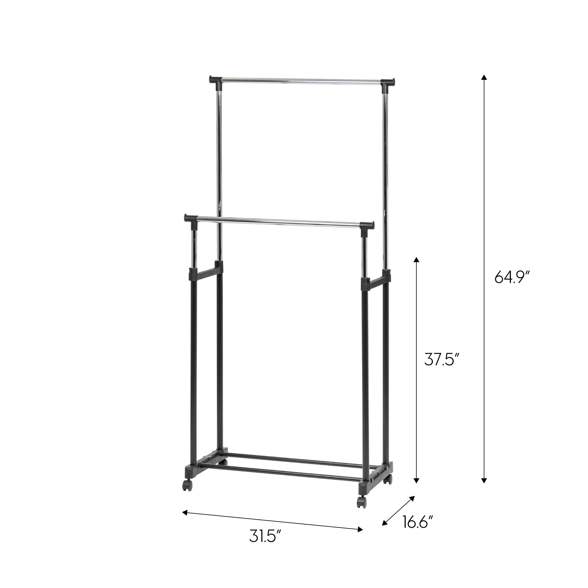 Clothing storage made easy. Double rod garment rack provides a convenient closet solution for small spaces. Adjust height from 37.5 to 65 inches to accommodate long dresses, jackets and coats. Wheels on the clothes rack make it easily transport between rooms. Bottom shelf is great for storing shoes and bags while two wide clothing bars give you plenty of space to hang your clothes. Assembly required. Weight capacity: 88 pounds total. Indoor use only. For safety, do not allow children to climb on or play with the product.ADJUSTABLE: Double rod on a garment rack is adjustable with the height from 37.5 to 64.9 inches to accommodates dresses, robes, long jackets and coats