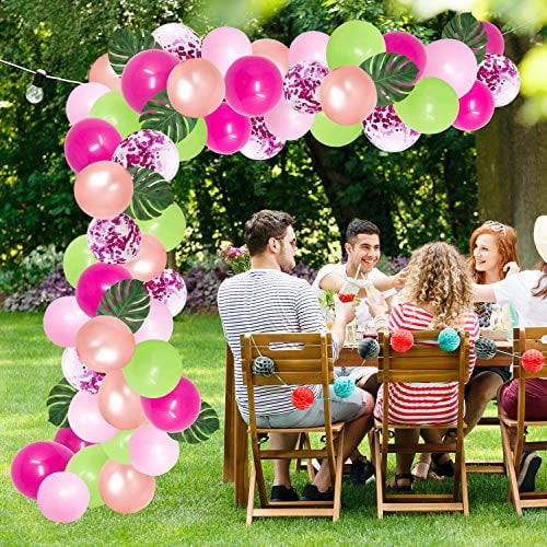 Adurself 76 Pieces Tropical Balloons Garland Kit 12” Green Hot Pink Rose Gold Pink Balloon Arch Garland with Palm Leaves for Hawaii Flamingo Luau Themed Birthday Party Baby Shower Decorations