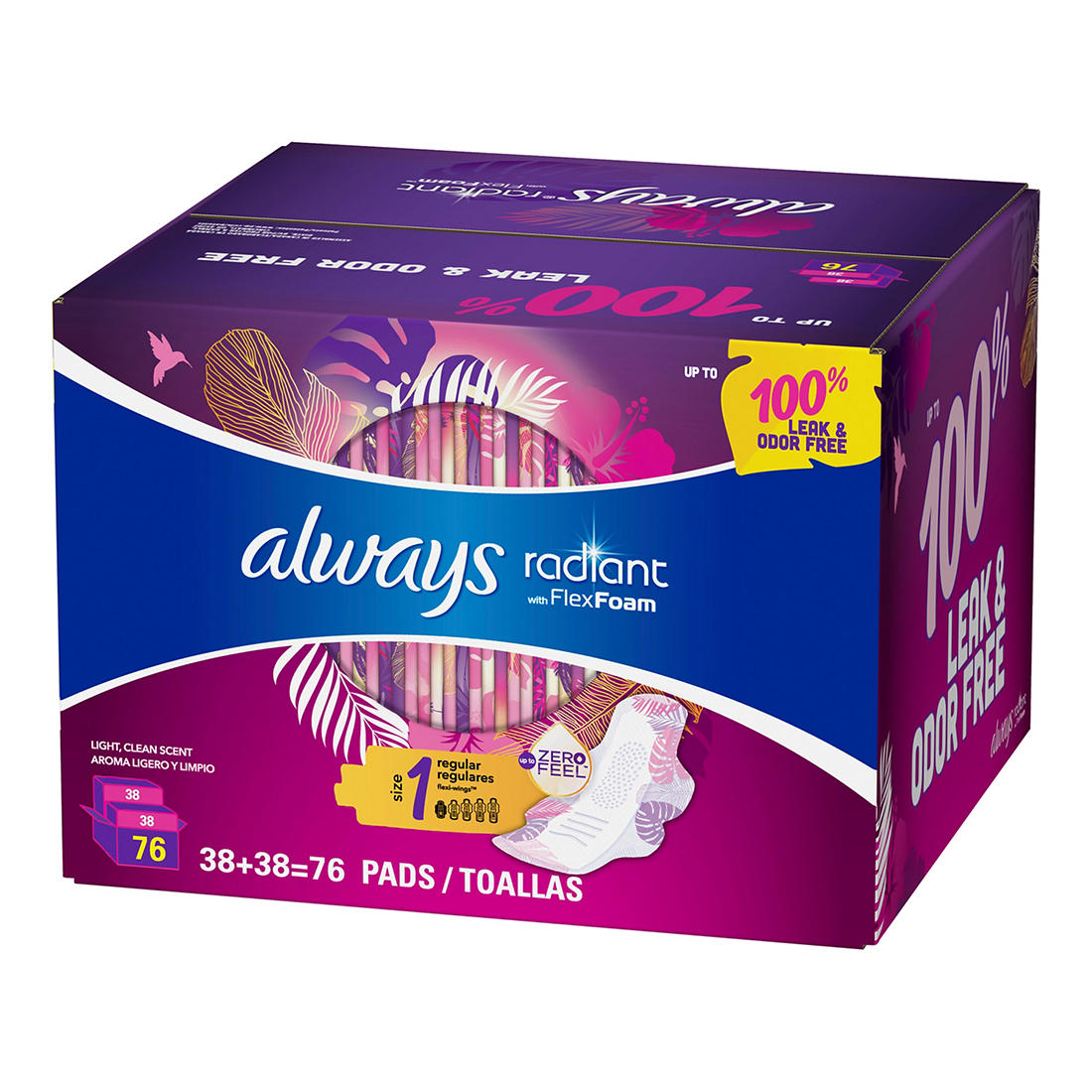 Always Radiant Regular Absorbency Pads with Wings, 76 ct.. Always Radiant Regular Absorbency Pads with Wings, 76 ct.Always Radiant Regular Absorbency Pads with Win…Always Radiant Regular Absorbency Pads w…. Find your groove with Always Radiant Pads Regular Absorbency, with up to 100% leak and odor-free protection. Inspired by the latest trends, you’ll love the tropical prints and patterns that remind you of sandy beaches and ocean breezes. Always Radiant features neon patterns on each pad wrapper and a surprise design inside each pack. Feel radiant with a sanitary pad that gives you both style AND comfort. Always Radiant is made with FlexFoam for a thin and flexible pad that doesn’t skip out on protection. With Always Radiant, you can wear what you want and do what you want any day of the month. Product Features: Up to 100% leak & odor-free protection so you can wear what you wantDesigns and patterns inspired by the latest trends because pads don’t have to be boringZero Feel protection is possible for ultimate comfort throughout the dayFlexFoam core is soft and flexible like memory foamAlways Radiant Pads Regular Absorbency neutralize odors which means no worriesFeatures a variety of ‘neon vibes’ pad wrappersREAD MORE