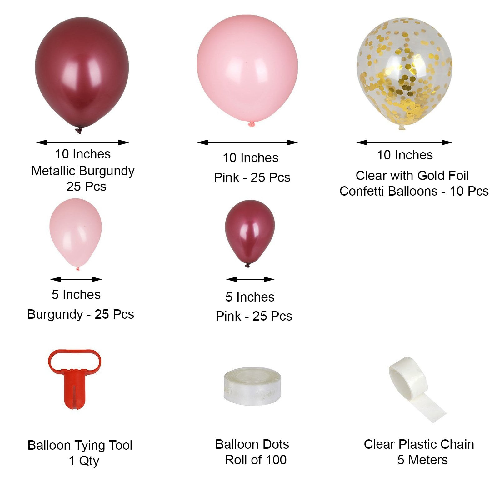 Total of 1 balloon tie, 100 balloon glue dots, 1 balloon strip, 16.4 ft of clear plastic chain and assembly instructions.