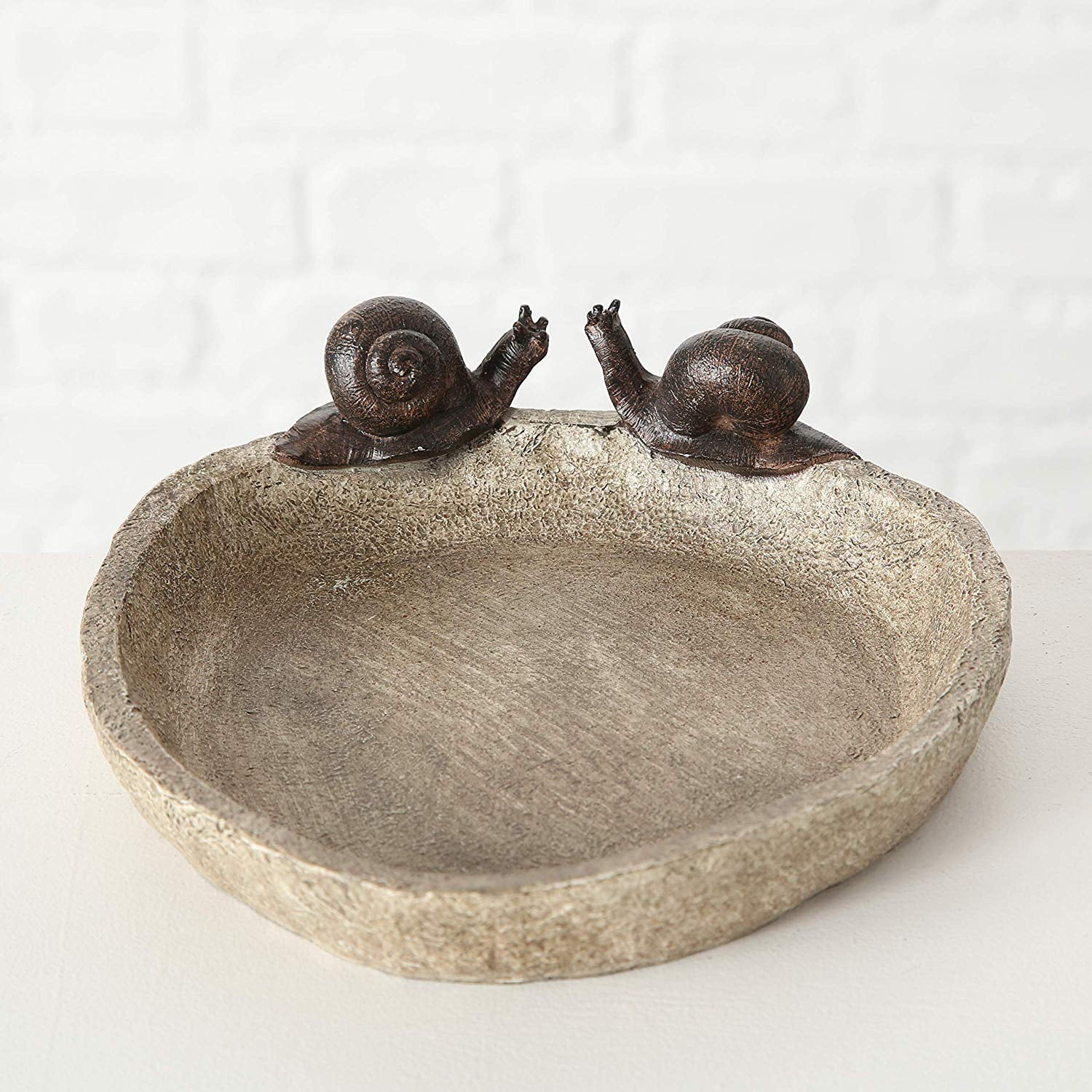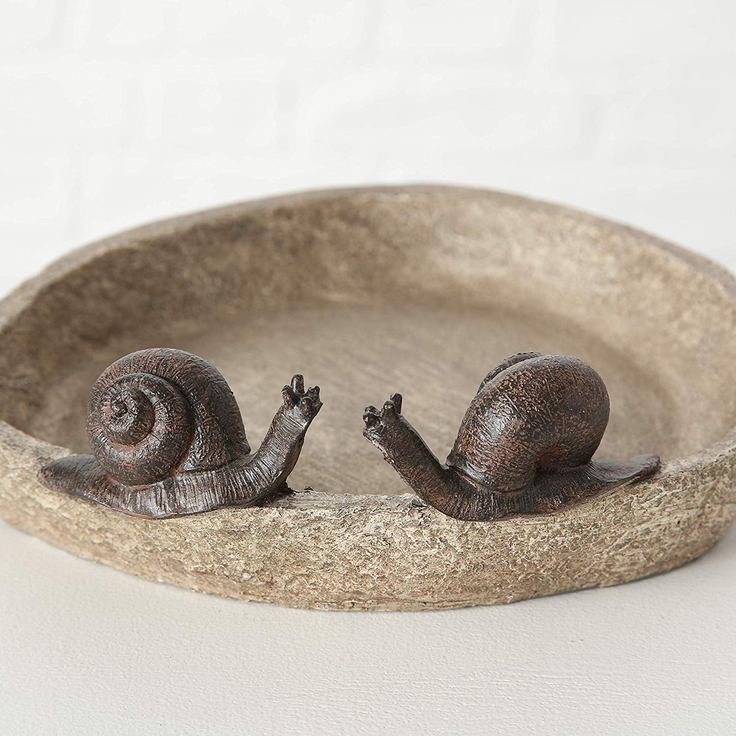 - The beige basin has a beautiful texture that mimics real stone and measures 8 1/4 inches in diameter. Each snail, made to look like bronze, is approximately 1 ½ tall x 2 ¾ inches wide.