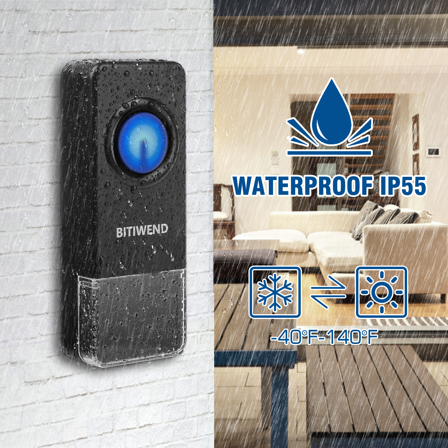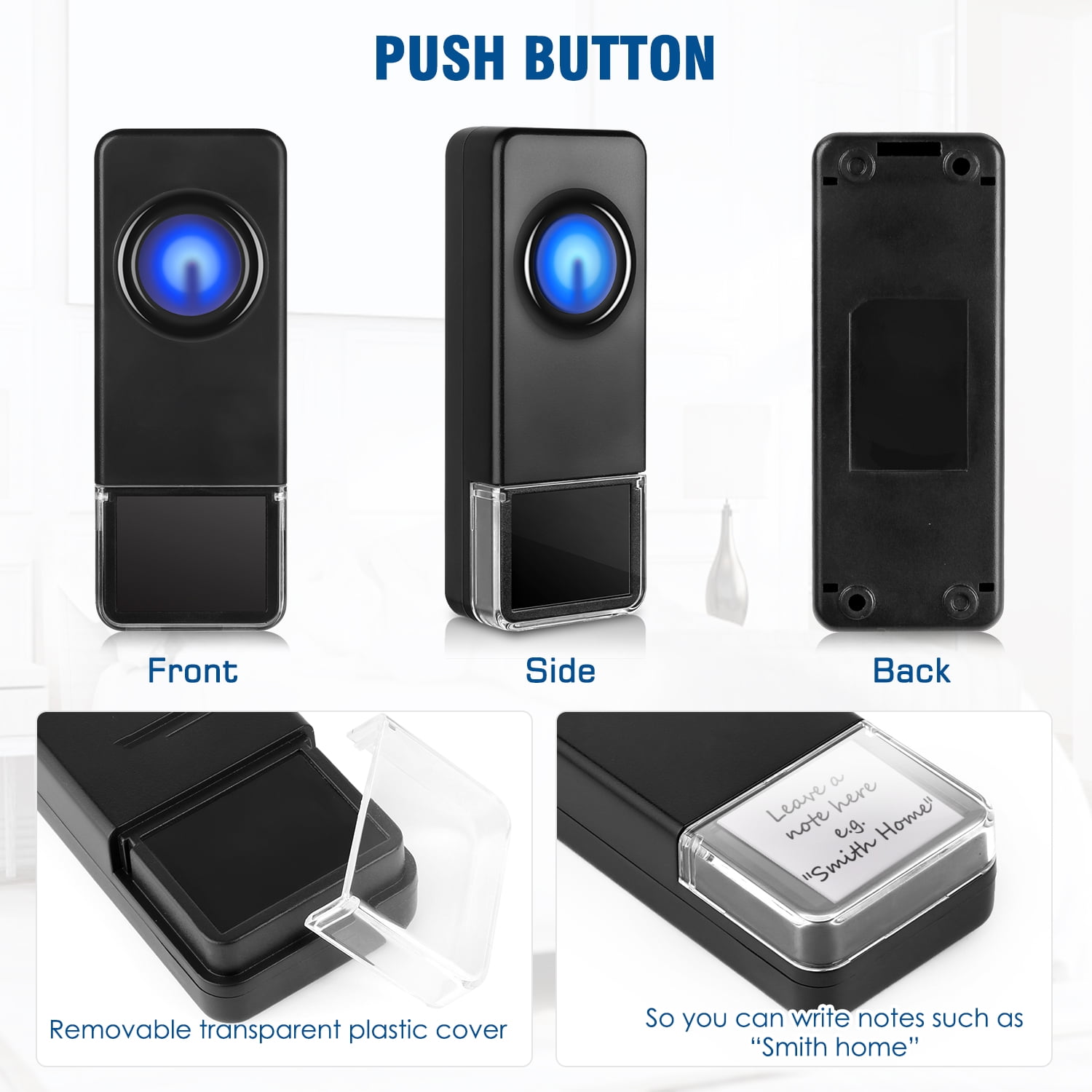 - 【Waterproof & Robust Push Button】Door bell chime Wireless has stylish modern design in classic Black, excellent materials keeps itself from getting higher temperature & interference. Waterproof & Dustproof, remote transmitter button is rated IP55 weatherproof. Doorbell Works between -4 °F to 140 °F; withstand various harsh weather conditions, acceptable for outdoor use. Our door bells are certified with CE, RoHS, FCC.