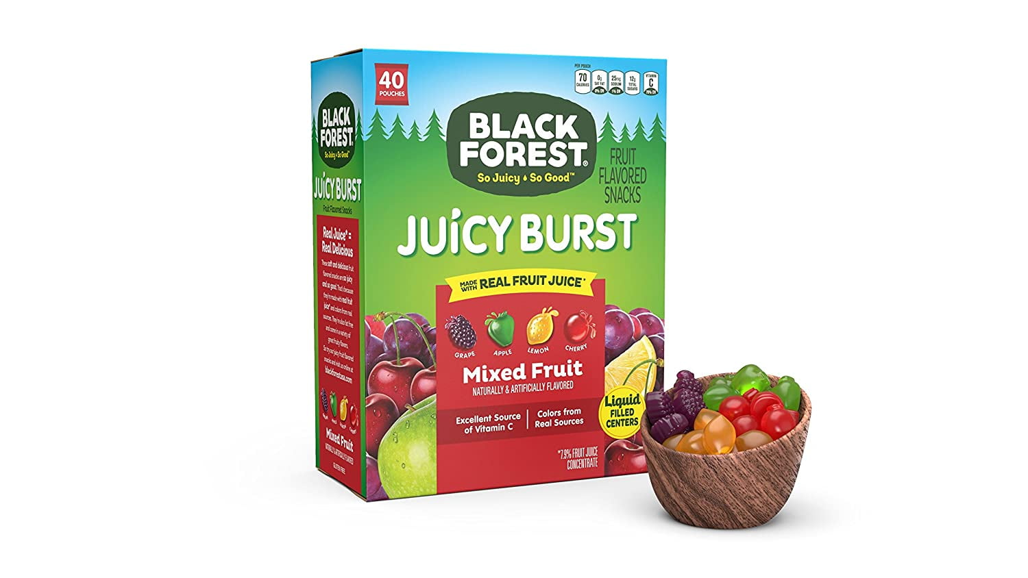 SO JUICY. SO GOOD: Add a burst of mixed fruit flavor to your day with Black Forest Juicy Bursts: fruit snacks with a liquid center (plus vitamin C ), the perfect sweet treat to add to your kid’s lunch box, share with friends, or just treat yourself. BLACK FOREST FRUIT SNACKS: Black Forest fruit snacks are for kids & kids at heart. Our soft & gummy fruit-flavored candy is gluten free, fat free, & full of authentic juicy flavor you’ll feel good about. Go ahead, treat yourself GET YOUR SNACK ON: From gummy bears to gummy worms, fruit snacks to sour heads, Black Forest candy is the perfect sweet snack to add flavor to your day. Real fruit flavors, naturally juicy. TASTE THE DIFFERENCE: What makes Black Forest gummies, fruit chews, & fruit snacks so good. Our classic & organic snacks have real fruit juice, so each gummy bear, chew, or fruit snack is soft, chewy, & fruity. SO JUICY, JA: You’ll love the juicy goodness of Black Forest gummies and fruit snacks. Add a moment of fun to your day with Black Forest candy, whether you treat yourself or share with others.Flavor Mixed Fruit Ingredients Fruit Juices from Concentrate (Apple, Cherry, Lemon, Grape), Corn Syrup, Sugar, Gelatin, Modified Food Starch (Potato), Citric Acid, Malic Acid, Pectin, Fruit and Vegetable Juices Added for Color (Black Carrot, Purple Carrot, Blueberry), Modified Food Starch (Corn), Ascorbic Acid (Vitamin C), Sodium Citrate, Coconut Oil*, Natural and Artificial Flavors, Turmeric (Color), Spirulina Extract (Color), BetaCarotene (Color), Carnauba Wax*.*Adds a trivial amount of fatFruit Juices from Concentrate (Apple, Cherry, Lemon, Grape), Corn Syrup, Sugar, Gelatin, Modified Food Starch (Potato), Citric Acid, Malic Acid, Pectin, Fruit and Vegetable Juices Add… See more Brand Black Forest Product Dimensions 8 x 3 x 8 inches; 3.2 Ounces Allergen Information Gelatin SO JUICY. SO GOOD: Add a burst of mixed fruit flavor to your day with Black Forest Juicy Bursts: fruit snacks with a liquid center (plus vitamin C ), the perfect sweet treat to add to your kid’s lunch box, share with friends, or just treat yourself. BLACK FOREST FRUIT SNACKS: Black Forest fruit snacks are for kids & kids at heart. Our soft & gummy fruit-flavored candy is gluten free, fat free, & full of authentic juicy flavor you’ll feel good about. Go ahead, treat yourself GET YOUR SNACK ON: From gummy bears to gummy worms, fruit snacks to sour heads, Black Forest candy is the perfect sweet snack to add flavor to your day. Real fruit flavors, naturally juicy. TASTE THE DIFFERENCE: What makes Black Forest gummies, fruit chews, & fruit snacks so good. Our classic & organic snacks have real fruit juice, so each gummy bear, chew, or fruit snack is soft, chewy, & fruity. SO JUICY, JA: You’ll love the juicy goodness of Black Forest gummies and fruit snacks. Add a moment of fun to your day with Black Forest candy, whether you treat yourself or share with others. Is Discontinued By Manufacturer : No Product Dimensions : 8 x 3 x 8 inches Item model number : 47149 Manufacturer : FERRARA CANDY CO Country of Origin : USA