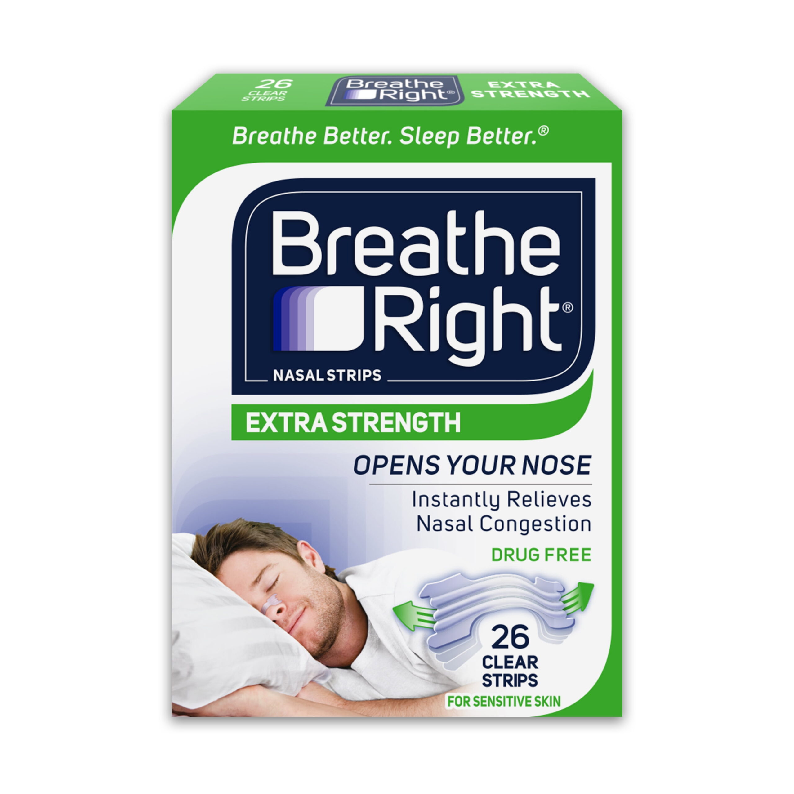 Breathe Right Nasal Strips, Extra Strength, Clear Nasal Strips, For Sensitive Skin, Help Stop Snoring, Drug-Free Snoring Solution & Nasal Congestion Relief Caused by Colds & Allergies, 26 Ct