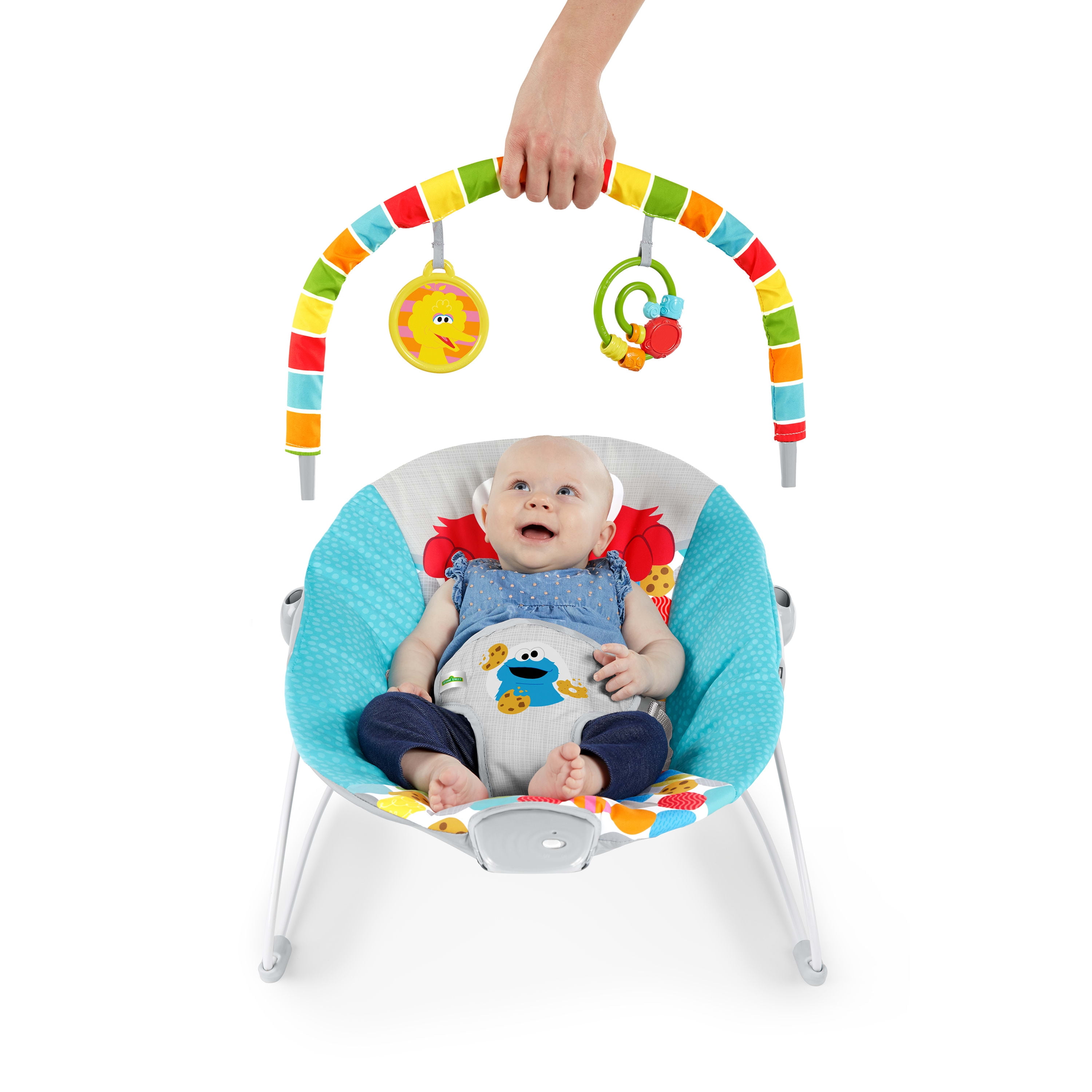 Straight from Sesame Street, Bright Starts presents the I Spot Elmo Vibrating Bouncer for your baby boy or girl. Easily remove the toy bar with one hand to slip baby into his new favorite bouncy seat. Your little one will go from grumps to giggles as he kicks and reaches for the 2 playtime toys hanging above. No matter how much he wiggles, baby is safe and secure in this baby seat thanks to a 3-point harness and nonslip feet. The deep comfortable baby bouncer is made out of Cookie Monster inspired fabric dotted with delectable chocolate chip treats. Soothing vibrations help your baby stay comfy and calm while resting safely in your sight. Recommended for 0-6 months.