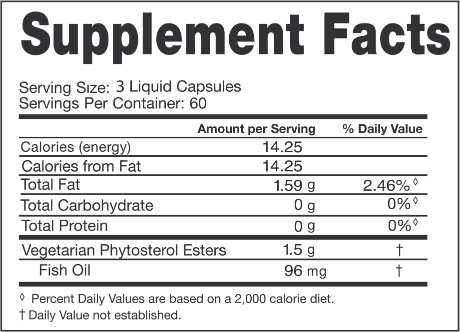CardioSterol contains plant phytosterol esters and Omega-3. Foods containing at least 0.65 g per serving of plant sterol esters, eaten twice a day with meals for a daily total intake of at least 1.3 g, as part of a diet low in saturated fat and cholesterol, may reduce the risk of heart disease. One serving of CardioSterol supplies 1.5 g of plant sterol esters.