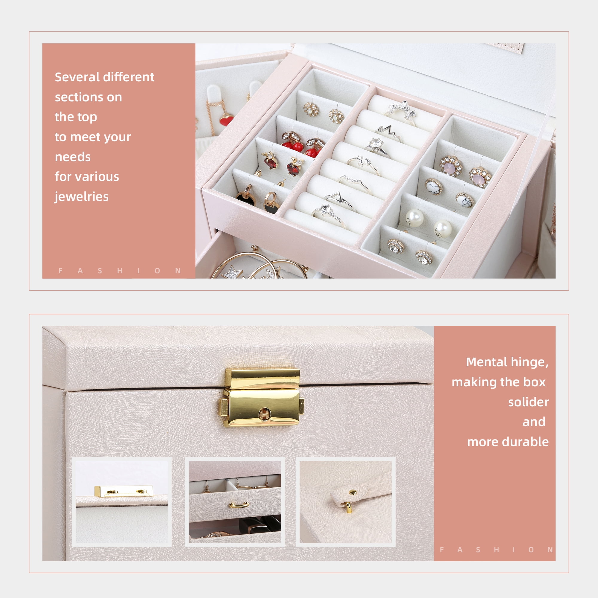 The Jewelry Box with Mirror has everything to please: a very practical built-in mirror, many modular compartments and a handle for easy transport.The two drawers are completely removable, practical for slipping your favorite watches or bracelets into them. Built-in detachable ear stud organizer, and the side panels contain a dedicated space for your necklaces and pendants.The jewelry box can storage rings, earrings, necklaces, makeup ect.The jewelry storage box can be used as furnishings to increase the sense of atmosphere. It is also the first choice for gifts to mothers, relatives and friends. It is suitable for all women and girls.