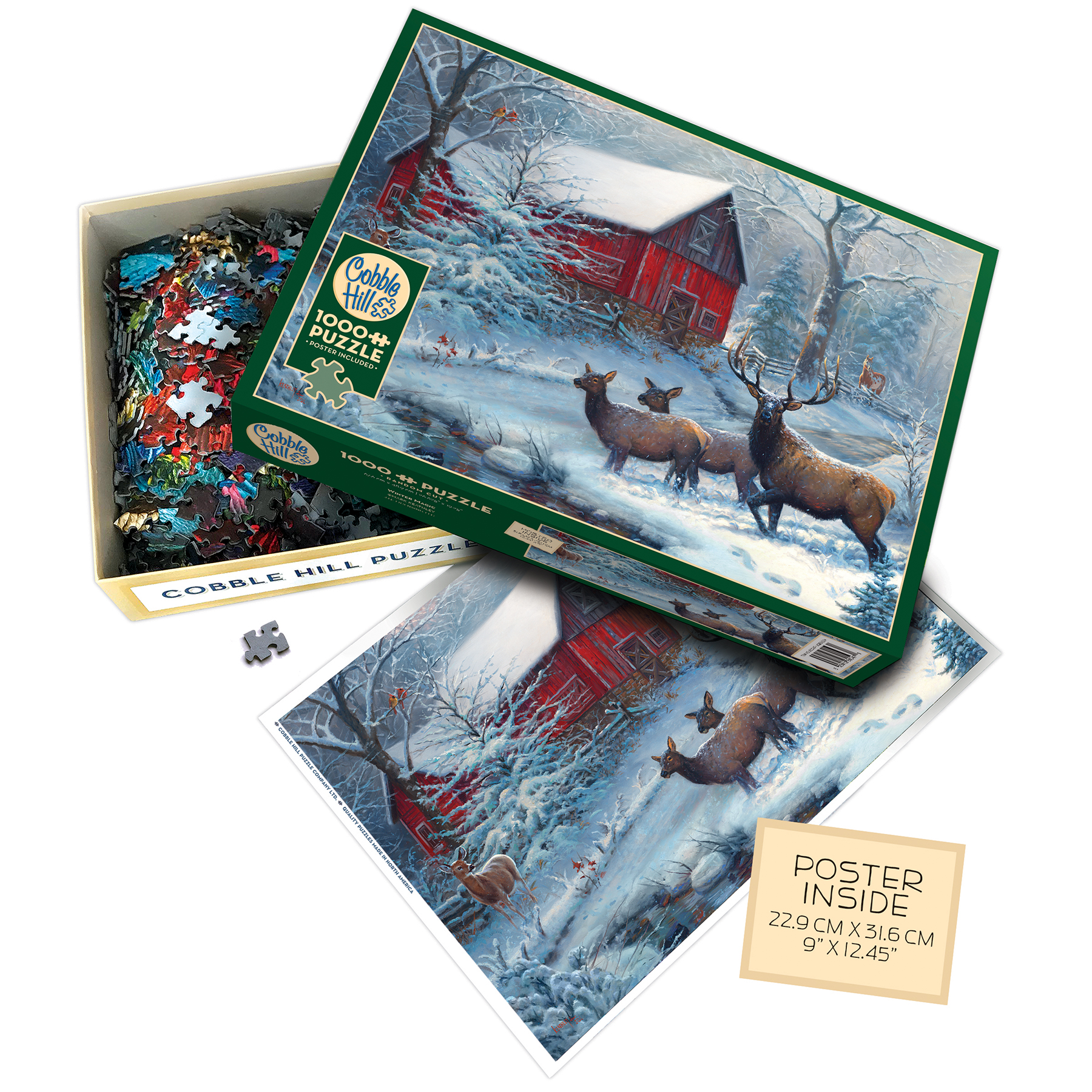 It’s simply Winter Magic for the deer and elk after a fresh coat of snow has fallen. It is so quiet and still around the red barn with the snow muffling every little sound, that the animals can relax and have a drink from the stream. Simply magic! A relaxing 1000 piece country image from artist Mark Keathley. Cobble Hill Puzzles are using the finest inks, premium grade blue board, linen paper, and the most endearing images. Our puzzles feature interesting random-shaped pieces, so no two pieces are alike. Includes a handy poster, making it easier for multiple people to work on the puzzle at the same time.