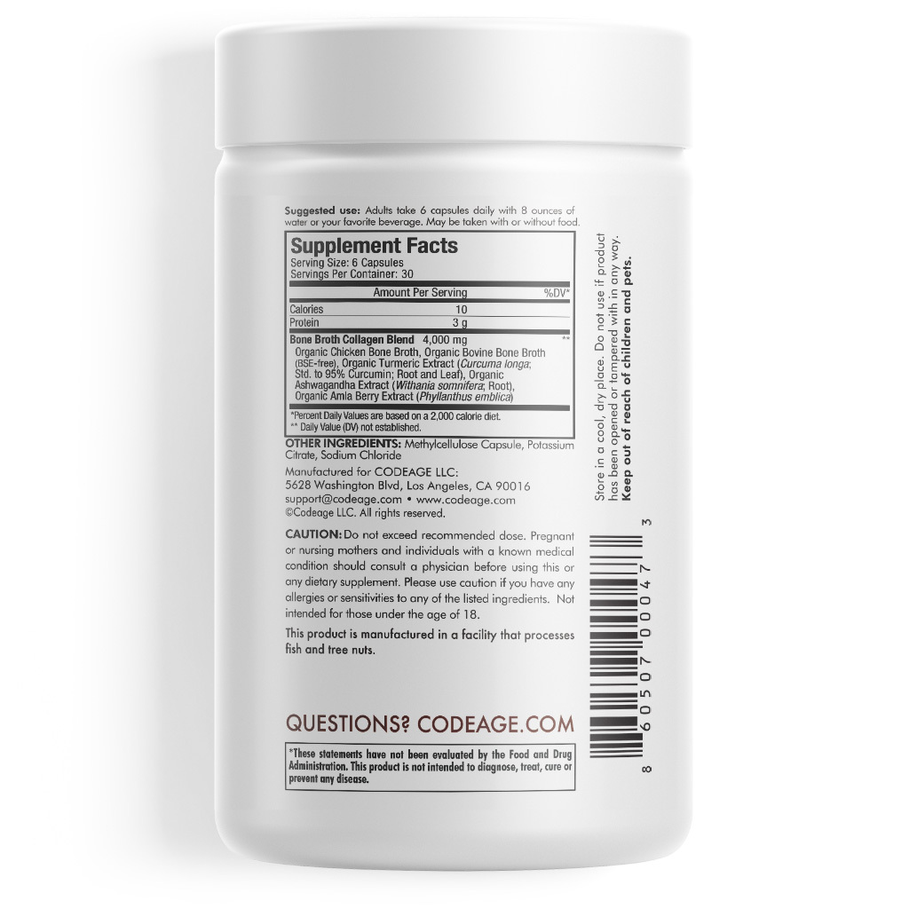 Codeage Bone Broth supplement provides Organic Bovine Bone Broth and Organic Chicken Bone Broth in a single formula. This grass-fed Bone Broth Collagen supplement is made with Pasture-Raised Bovine Bone and Organic Free-range Chicken Bone Broth. These Collagen Bone Broth capsules provide Collagen types I, II & III. This Bone Broth Collagen formula also features Organic Turmeric (95% curcumin extract), Organic Ashwagandha extract, and Organic Amla Berry extract.