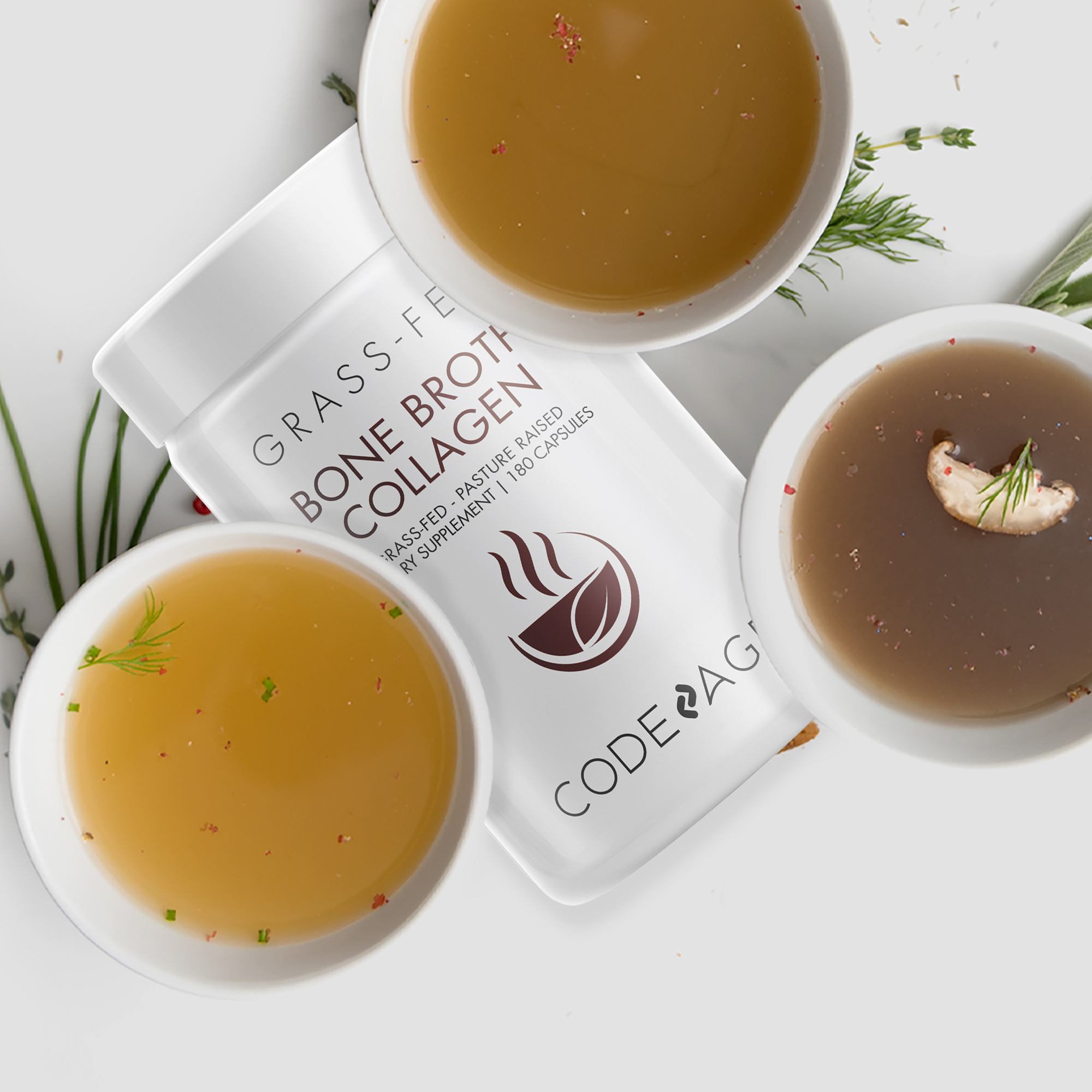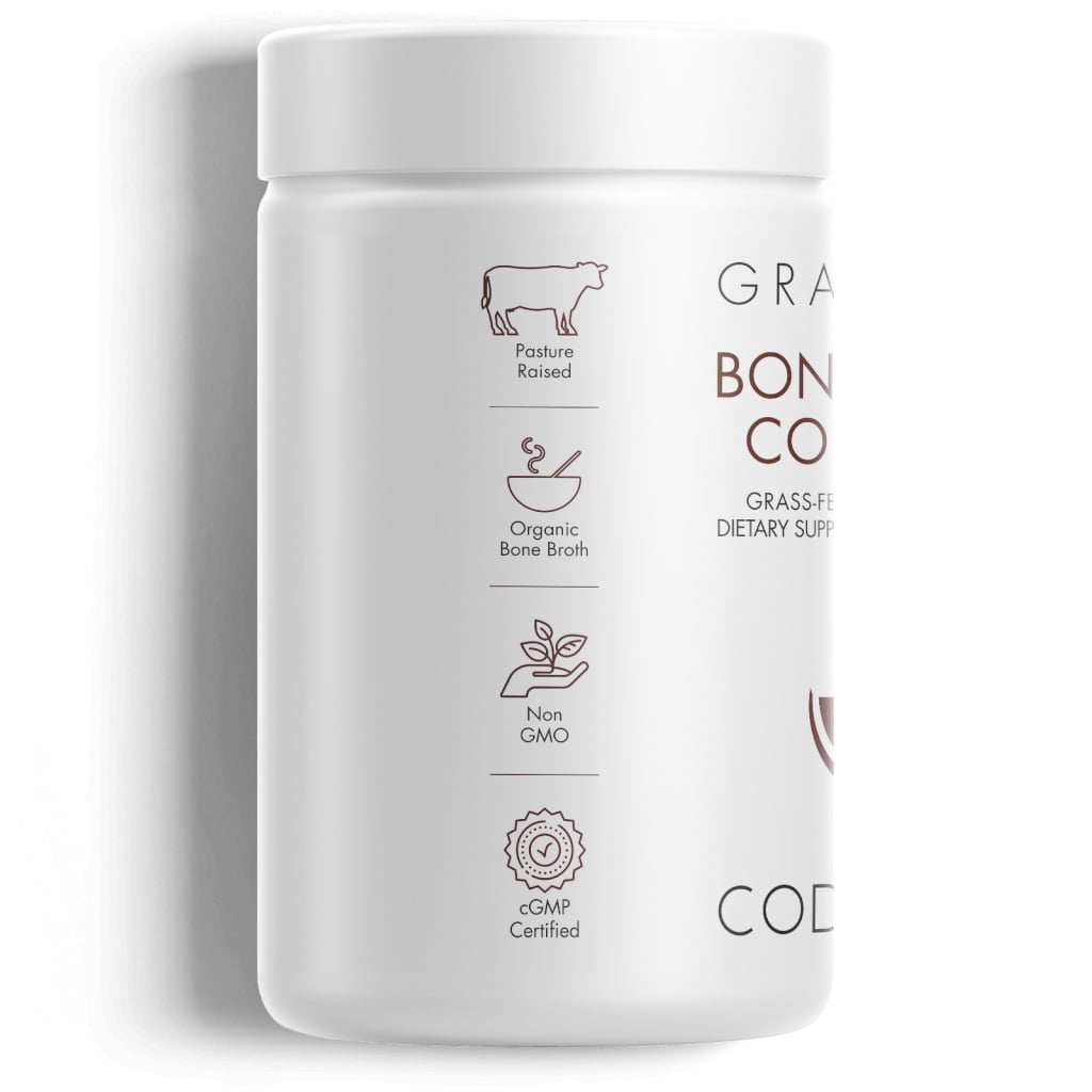 - Organic Bovine Bone Broth Capsules: Codeage Bone Broth Collagen features Organic Beef Bone Broth in a convenient and easy to use capsules format. This Bone Broth pills supplement offers Grass-Fed and Pasture-Raised bovine.