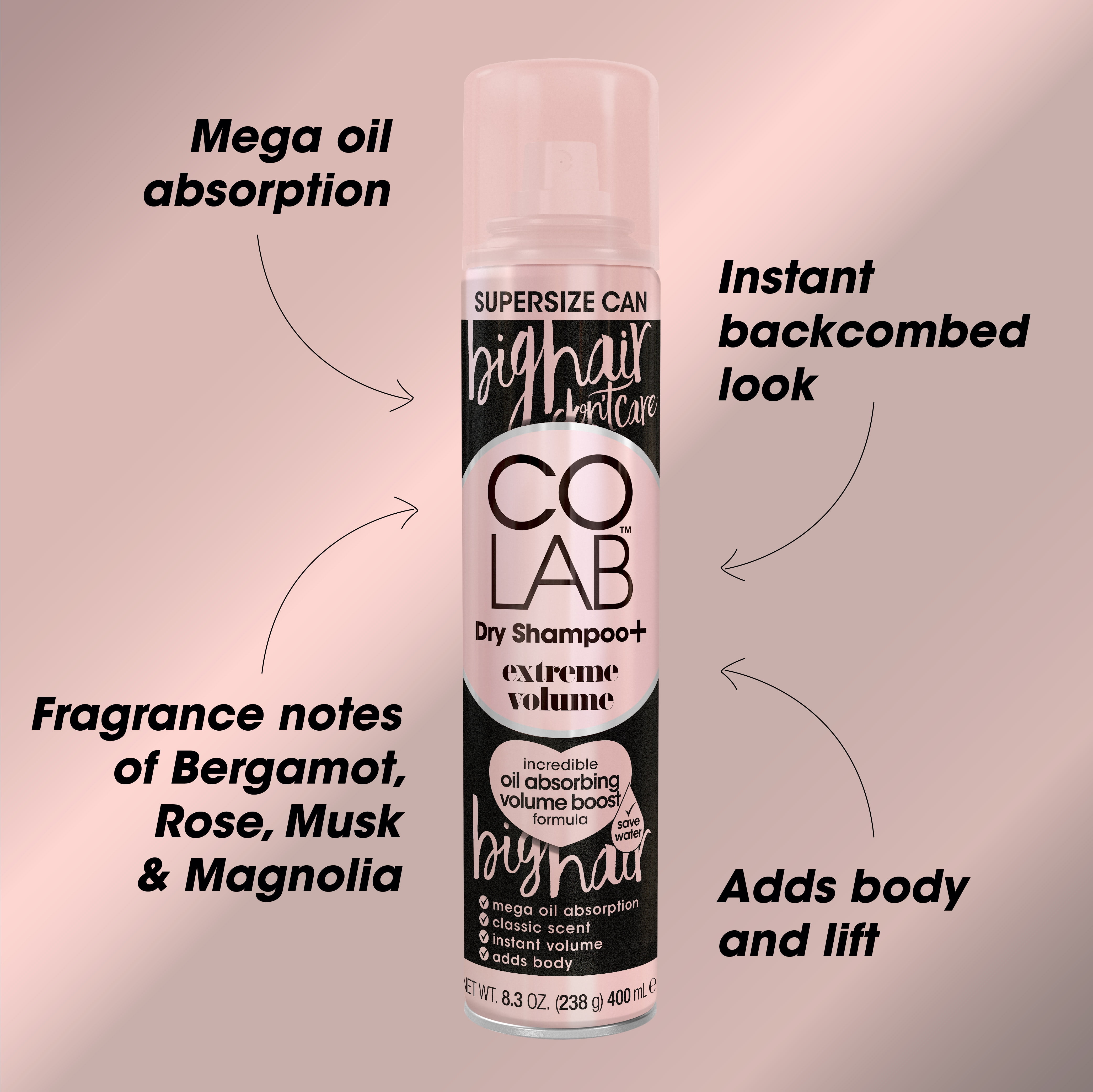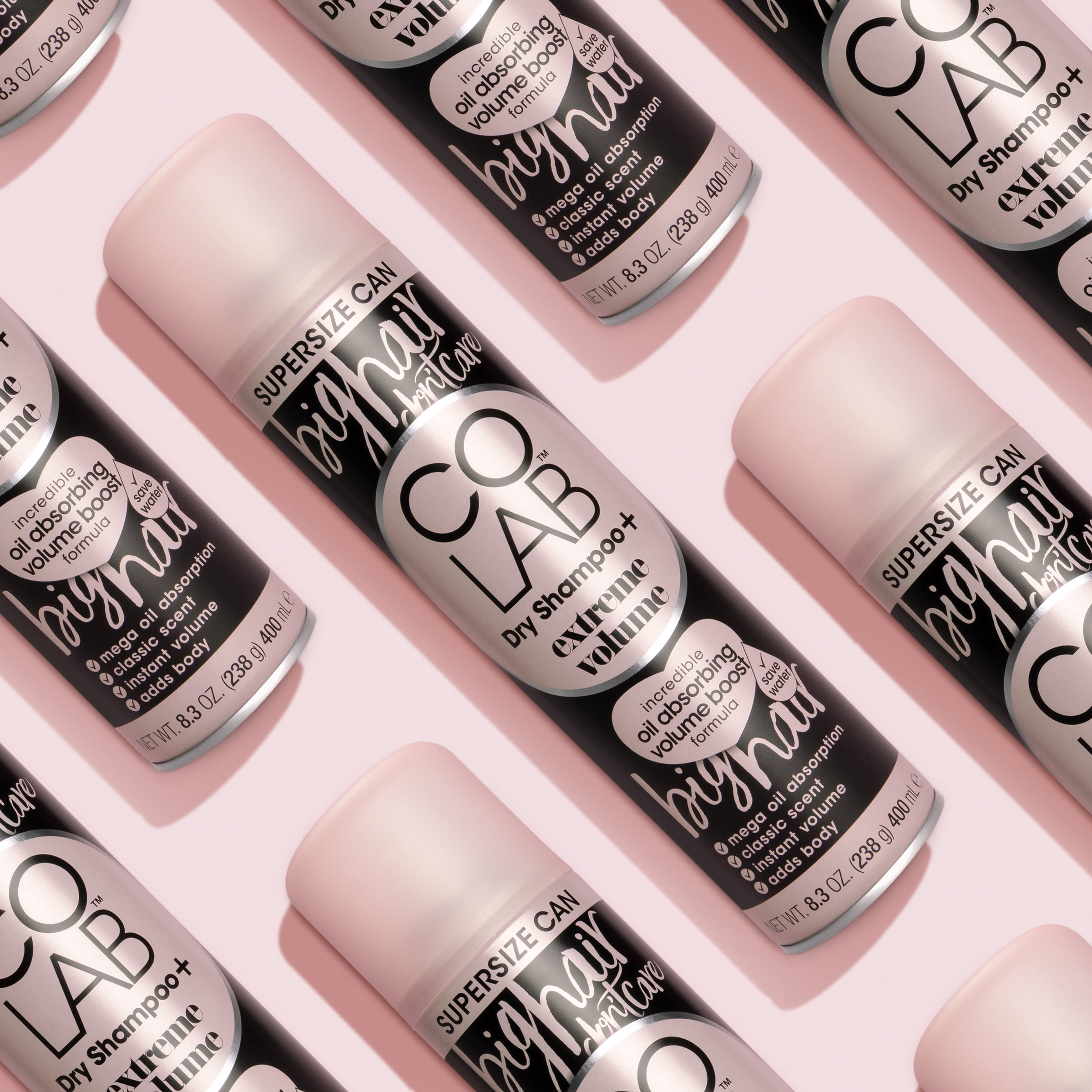 COLAB Dry Shampoo + Extreme Volume gives lifeless hair an instant backcombed boost with amazing body and oomph. The incredible volume-boosting formula effectively absorbs oil and refreshes roots while adding instant body, texture and lift. Just a quick spray will leave your hair with ultimate body – big hair don’t care! What’s more, it’s fragranced with the effortlessly cool vibes of COLAB’s original classic scent, featuring sophisticated notes of bergamot, rose, musk and magnolia. Plus it’s dermatologist approved. As with all COLAB dry shampoos, Extreme Volume is vegan friendly and cruelty free. Instructions: 1. Shake well, hold the can 8" from dry hair and spray into roots. 2. Tease with fingertips to achieve instantly effortless backcombed volume, texture and lift. Brush through to finish if required. 3. Layer more product to build height and body for amazing texture.