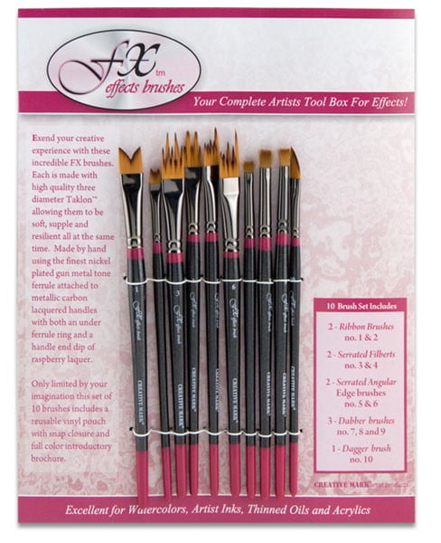 Extend the creative experience with these incredible brushes from Creative Mark, ideal for painting special effects with watercolors, inks and thinned acrylics or oils. Made of high quality Taklon hair in three different diameters, FX Brushes are soft, supple and resilient, all at the same time. Each brush is hand-made using the finest nickel plated, gun metal colored ferrule that is attached to metallic carbon black handles with raspberry color ring and dipped end. Set of 10 – This wonderful set is sold in a very nice quality re-sealable vinyl pouch with snap closure that includes a full color introductory brochure. Included in each set are the following brushes: Ribbon style brushes in large size number 1 and small size number 2. This shape is perfect for picking up multiple layers of color for creating a ribbon effect. They produce matching parallel effects as well. Multi-liner style brushes in size number 3 medium and size 4 large. These unique brushes allow for a wide arrange of effects including making grass, foliage, overlapping textures and special effect. They are made of 5 individual brush heads in different lengths and may be loaded with different colors to create harmonies in nature more easily. Angular Multi-liner style brushes in number 5 medium and number 6 large. These are primarily used for wave effects, multiple cross hatching strokes and for creating an assortment of dimensional effects. They are angled downward to create a more fluid, swirling and decorative effect. The Dabber style brushes in small size 7, large size 8 and medium size 9 create textured circles for making animal fur and hair patterns as well as for water effects. The Dagger style brushes in medium size ten makes uniform fine lines from short to long strokes and for creating floral leaf effects, flame effects and scroll effects. Of course the usages of each brush are only limited by your imagination.