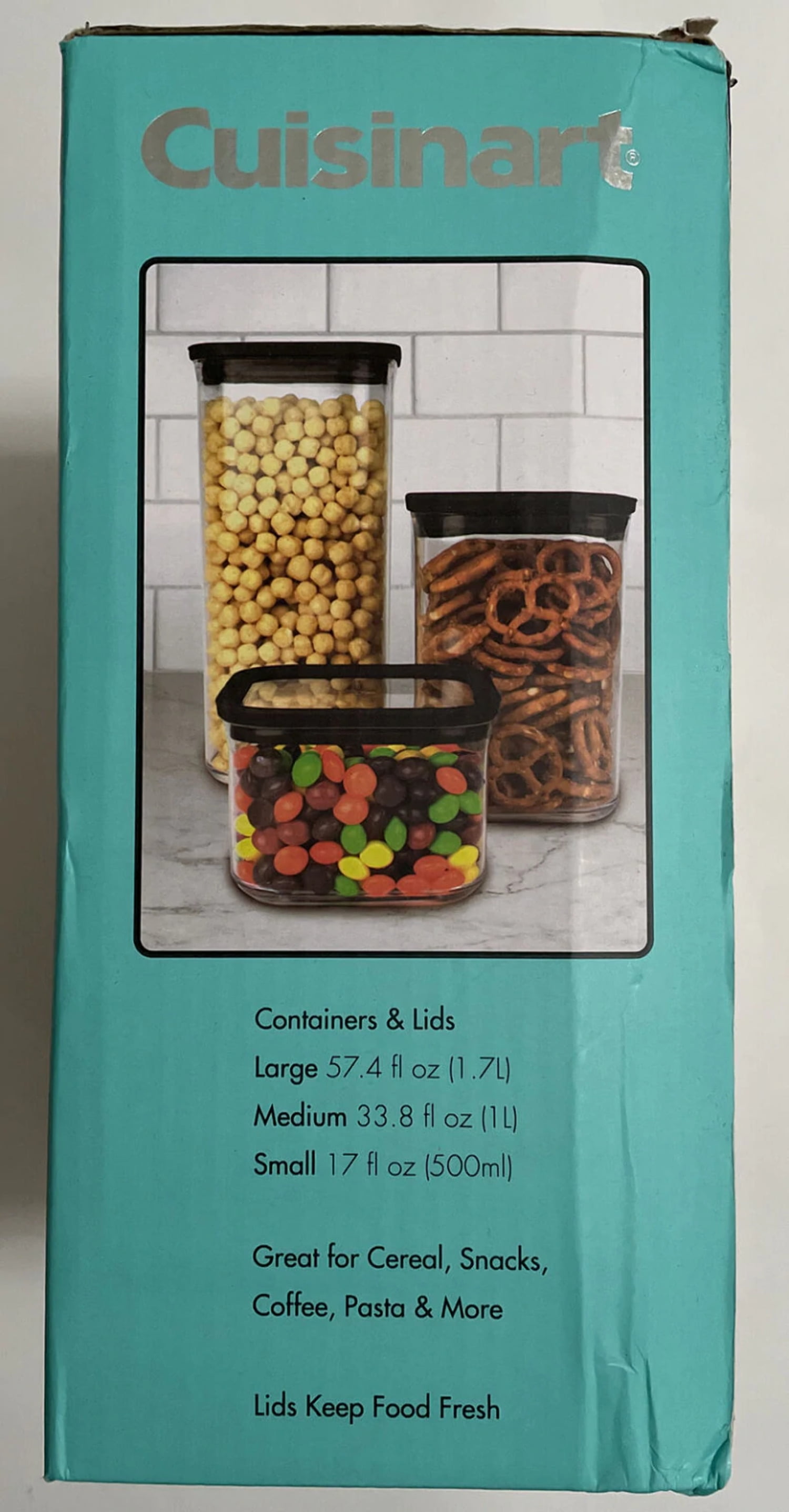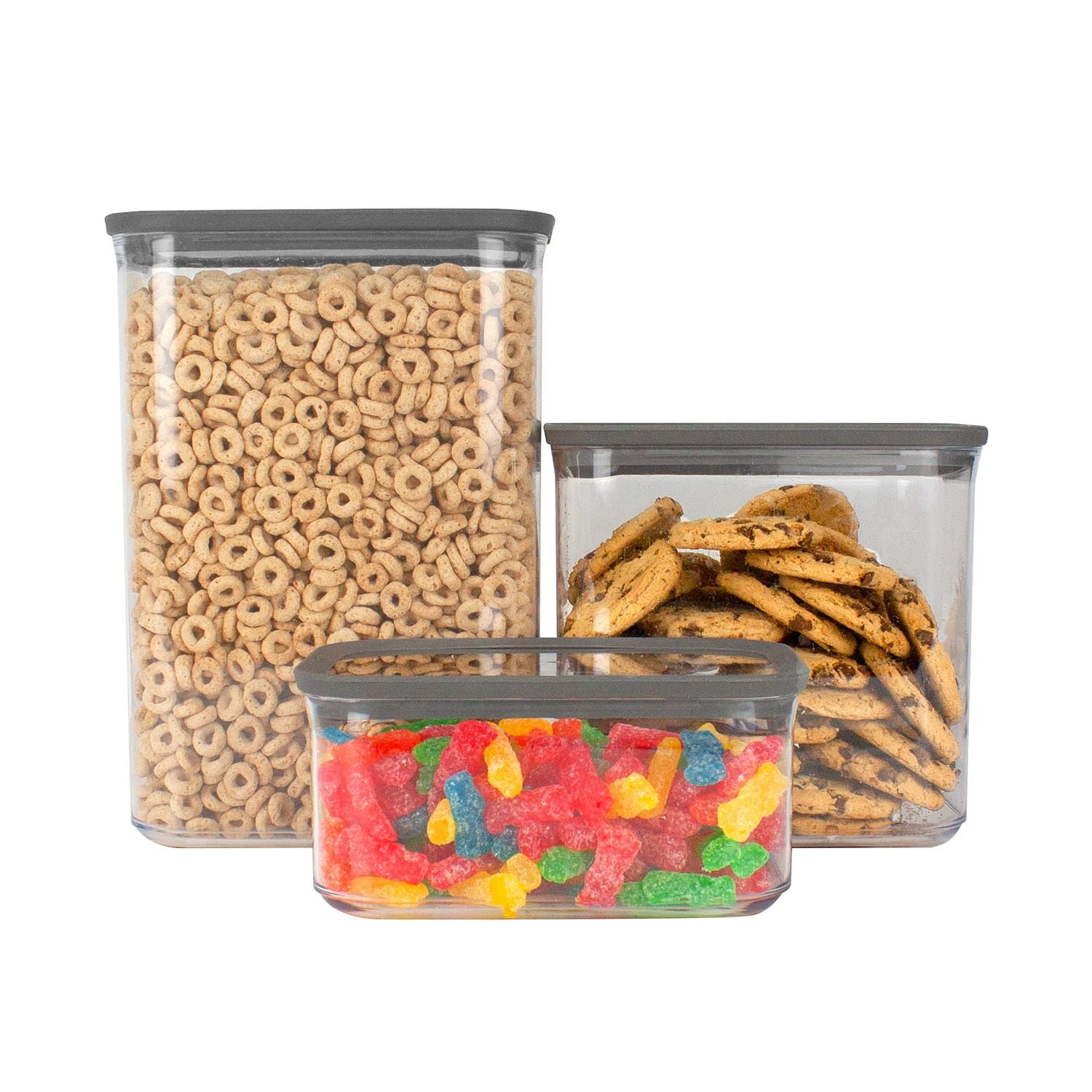 6 piece storage set (containers & lids)-Large: 57.4 fl oz (1.7L)-Medium: 33.8 fl oz (1L)-Small: 17 fl oz (500ML)Lid keeps food freshFor dry food onlyPlasticHand WashStackable for storage and organization of cereal, snacks, coffee, pasta more.Stackable for storage and organization of cereal, snacks, coffee, pasta more. 6 piece storage set