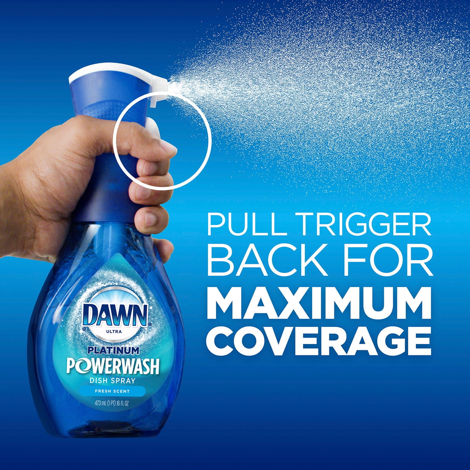 Dawn Platinum Powerwash Dish Spray’s the faster, easier way to clean as you go. You just spray, wipe and rinse to stay ahead of the mess and get done faster. The spray-activated suds cut through grease on contact, without water, for 5x faster* grease cleaning. And keep pumping the trigger for a continuous spray to cover larger dishes. In fact, it’s so easy, you can get through most of your dishes before you’re even done cooking.Dawn Platinum Powerwash Dish Spray, Dish Soap, Fresh Scent Bundle, 1 spray (16 oz.) plus 2 refills (16 oz. ea.)
