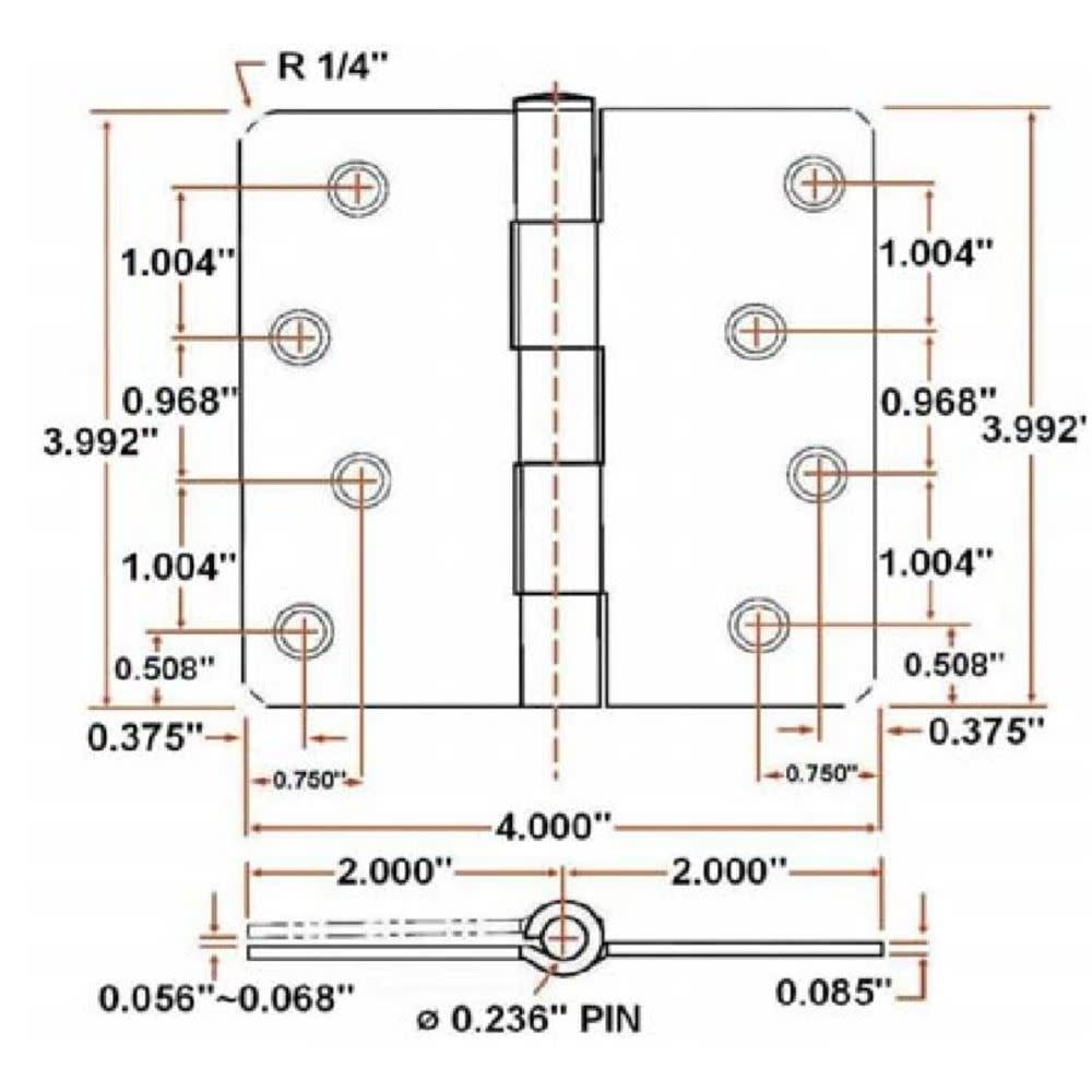 The Design House 181545 10-Pack Hinge 4" in Satin Nickel has a 1/4" radius corner, for use on residential duty wooden doors. These door hinges are made of steel with a staggered hole pattern. Each hinge has 8 holes and measures 4" x 4" x 1/2". These hinges do not have a removable pin, and screws are included. Designed and manufactured by Design House, the trusted source for quality lighting, hardware, plumbing, kitchen, and bath products for every taste and budget.This product comes with a 1-year limited warranty