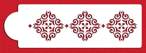 This stencil is the second tier pattern shown on the four tier Mexican Tile Cake Set (C540). This design measures 3.4"H x 11.9"W and is cut out of 10 mil, durable food-grade plastic.