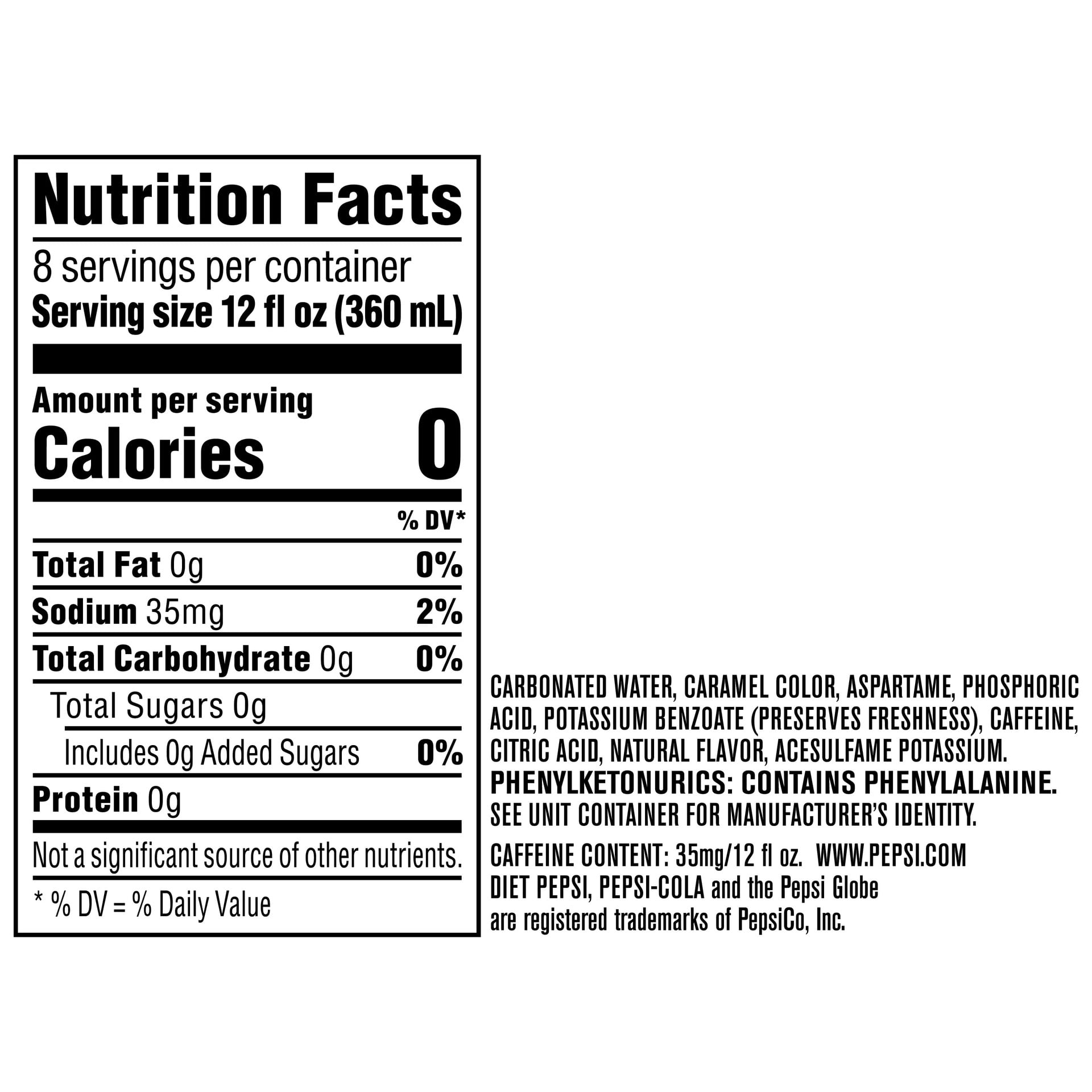 - Classic diet Pepsi taste. Per Bottle: 0 calories; 0g trans fat (0% DV); 35 mg sodium (2% DV); 0 g sugars. Sugar free.