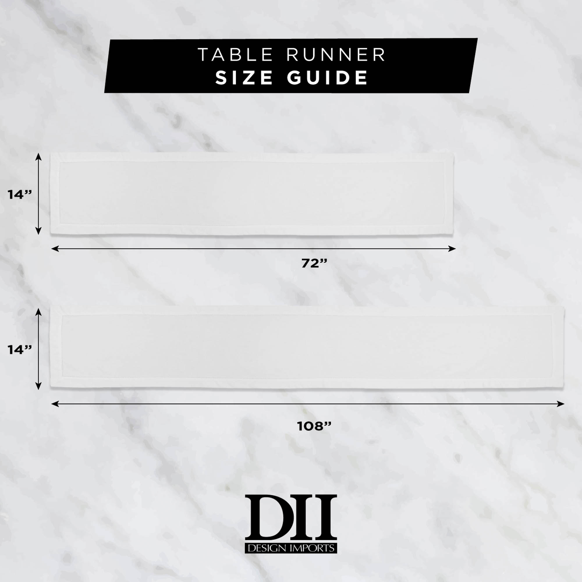 - This table runner measures 14×72" in size, appropriate for a table that can seat 4-6 people.