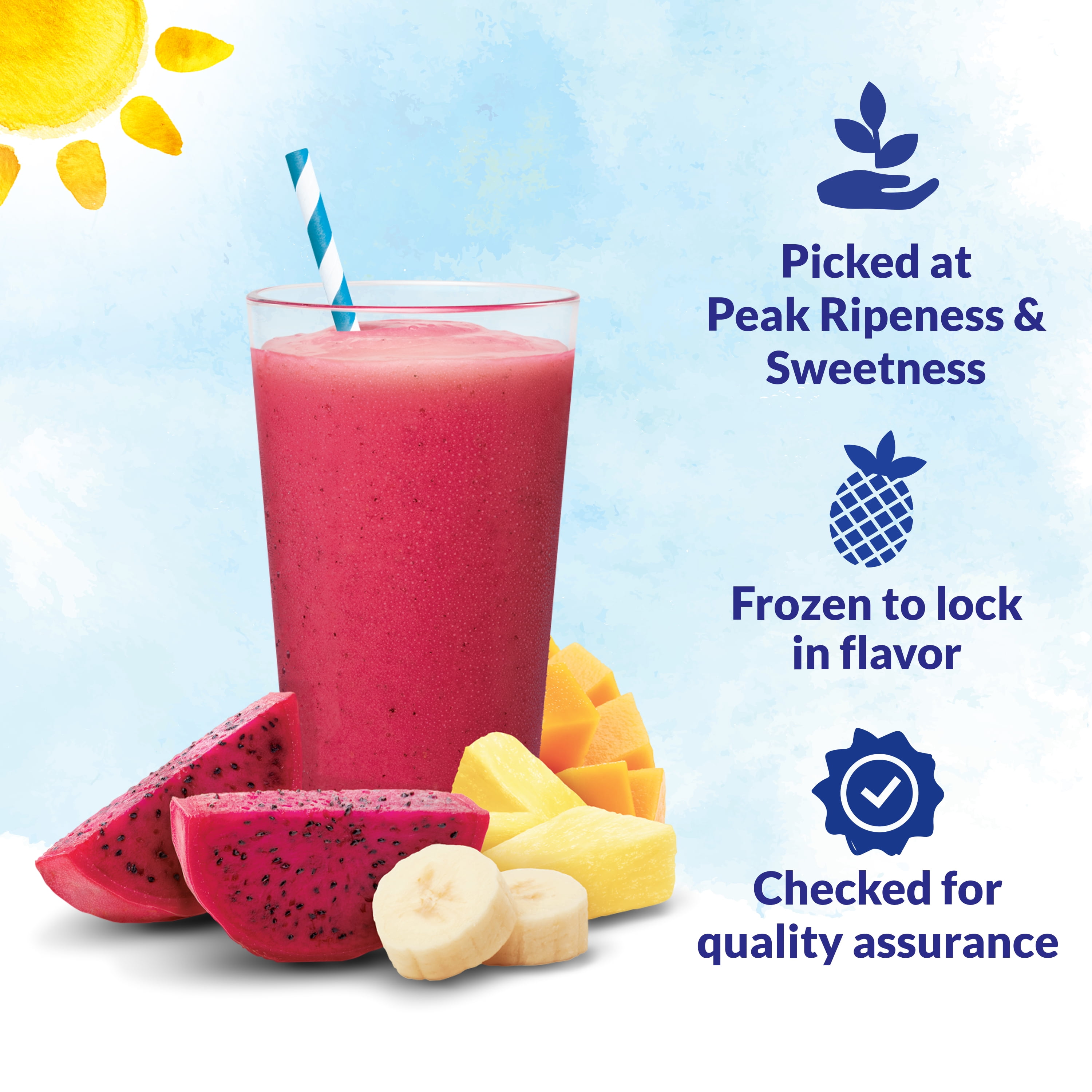 Dole Tropical Fruit Blend with Dragon Fruit Crafted Smoothie Blends delivers a delicious artisan smoothie like no other. Our blend combines a mix of golden pineapple, creamy bananas, juicy mango, and radiant dragon fruit to elevate your morning routine. The Dole Crafted Smoothie Blend contains an excellent source of Vitamin C, a good source of fiber, no trans fat or saturated fat, and no added sugars. Enjoy the refreshing taste of Dole Tropical Fruit Blend with Dragon Fruit Crafted Smoothie Blends!