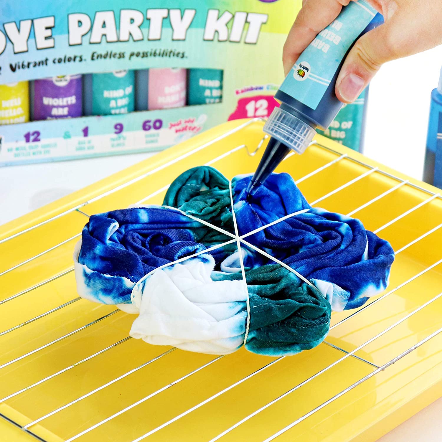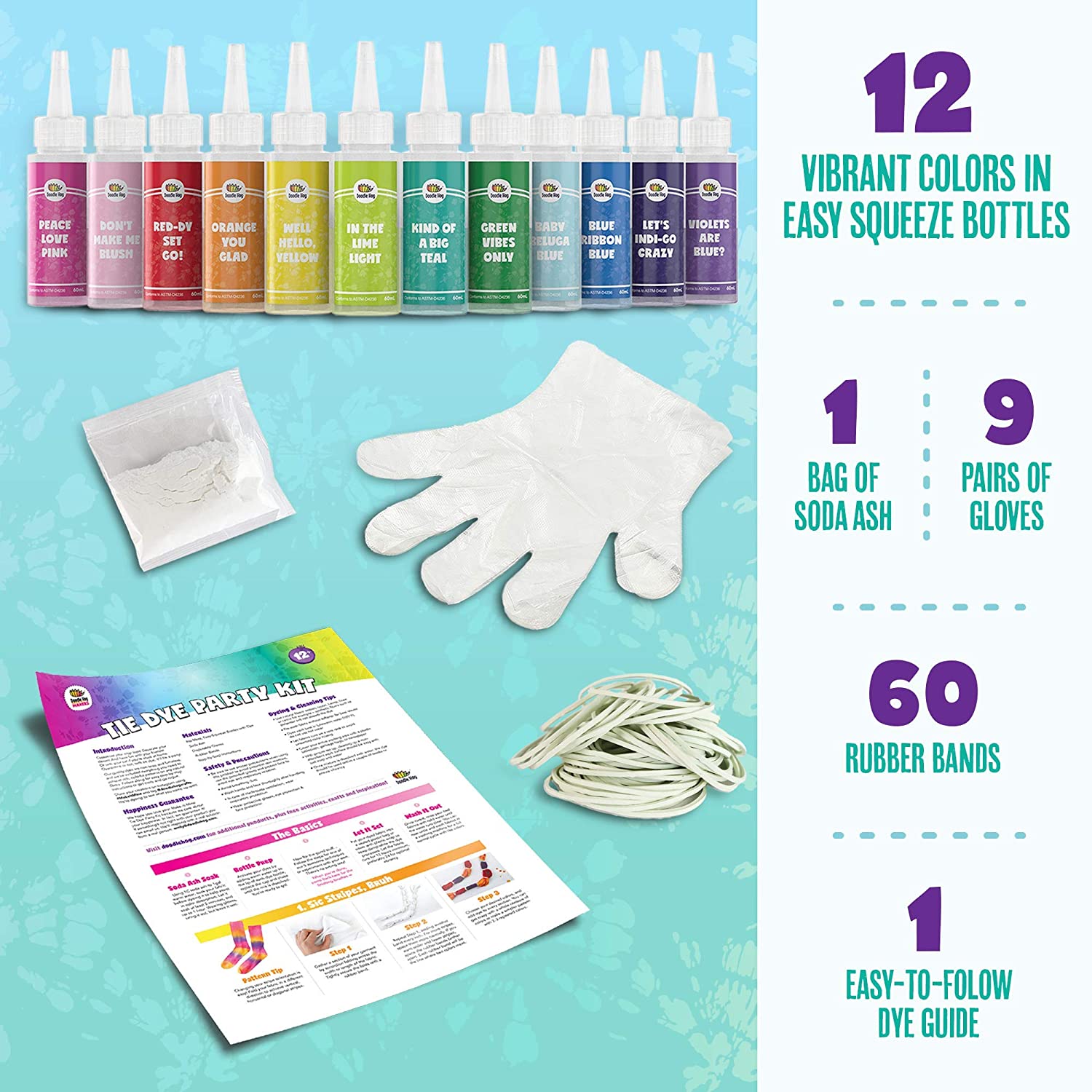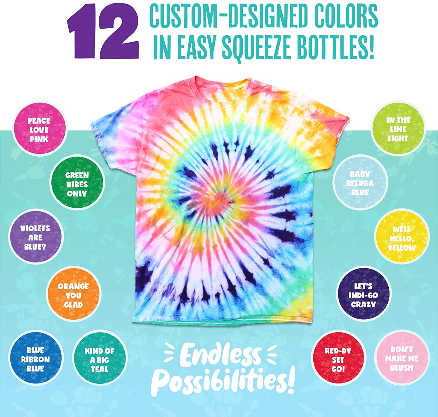 Our ultimate kit provides everything that you need for your custom tie dye projects! Simply add water to the powdered dye in the easy-to-squeeze bottles and start creating. We designed the best and brightest non-toxic color dyes so you can tie dye with all the colors of the rainbow. 60 rubber bands (ties) Instructions Tie dye technique guide 12 Custom Colors! Design your projects using one color, your favorite team colors, a mix of cool colors, your top 5 tones, or all the colors of the rainbow.