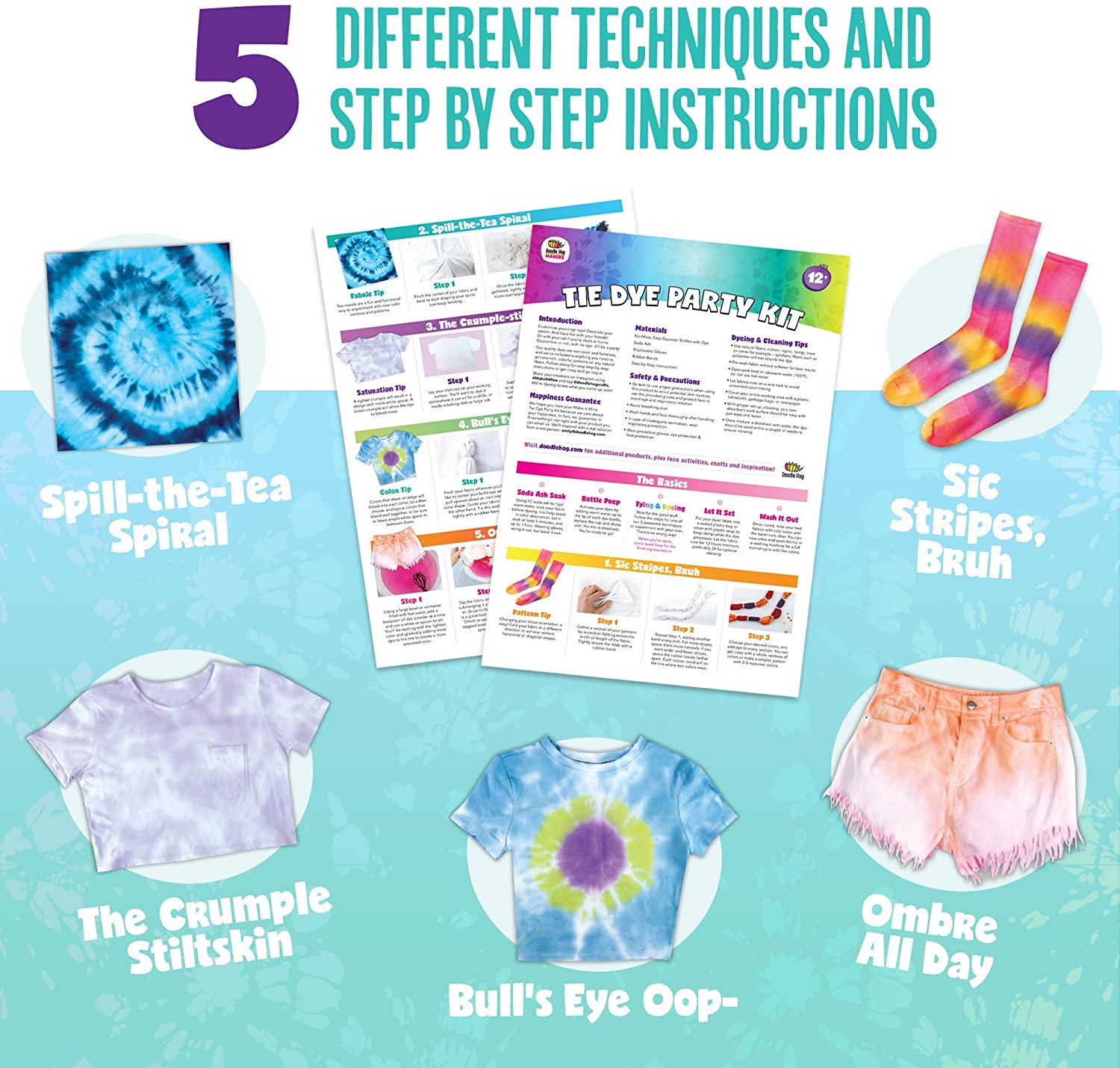 - Each kit comes equipped for a group of 6 people to tie dye to their hearts’ content.