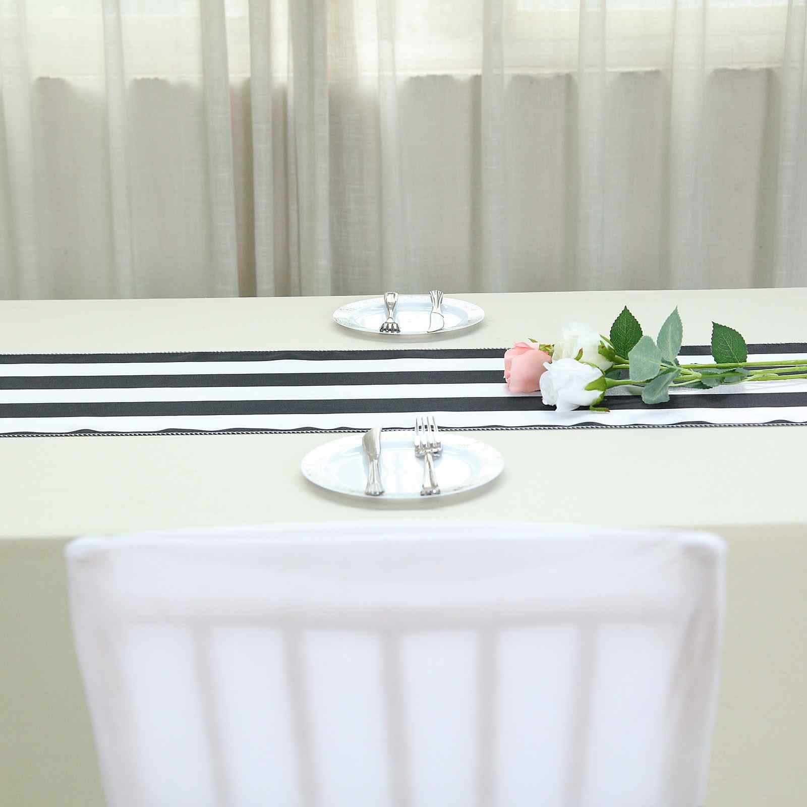 - Quantity: 1 Table Runner Material: Satin Color: Black & White Size: 108" Length x 12" Width Pattern: Stripe Stripe Size: 2" Wide Edge: Serged Total Stripes Count: 5 Full, 1 Partial Stain & wrinkle resistant All sizes are approximate measurements