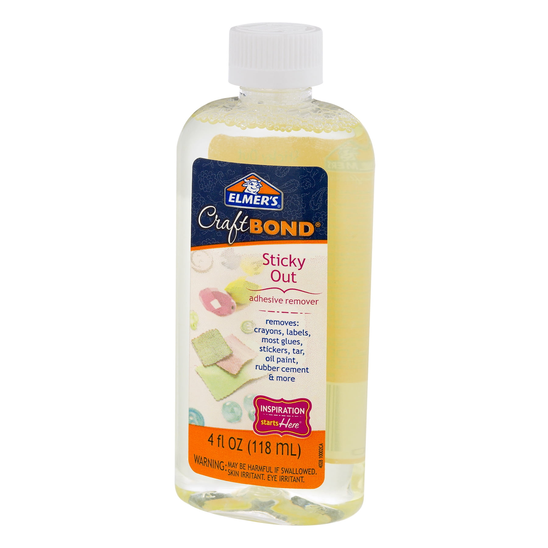 This Elmer’s Craft Bond Sticky Out adhesive remover removes residue such as crayon, labels, glue, stickers, tape, oil paint and rubber cement.Elmer’s Craft Bond Sticky Out, 4 oz:Removes crayons, labels, glues, stickers, tar, oil paint and morePerfect for eliminating your gooey, gummy, sticky cleaning problems100 percent safeNo harmful chemicalsWorks on virtually any surface including clothing, skin, hair, carpet and upholsteryCan be applied to some fabric when used according to directions