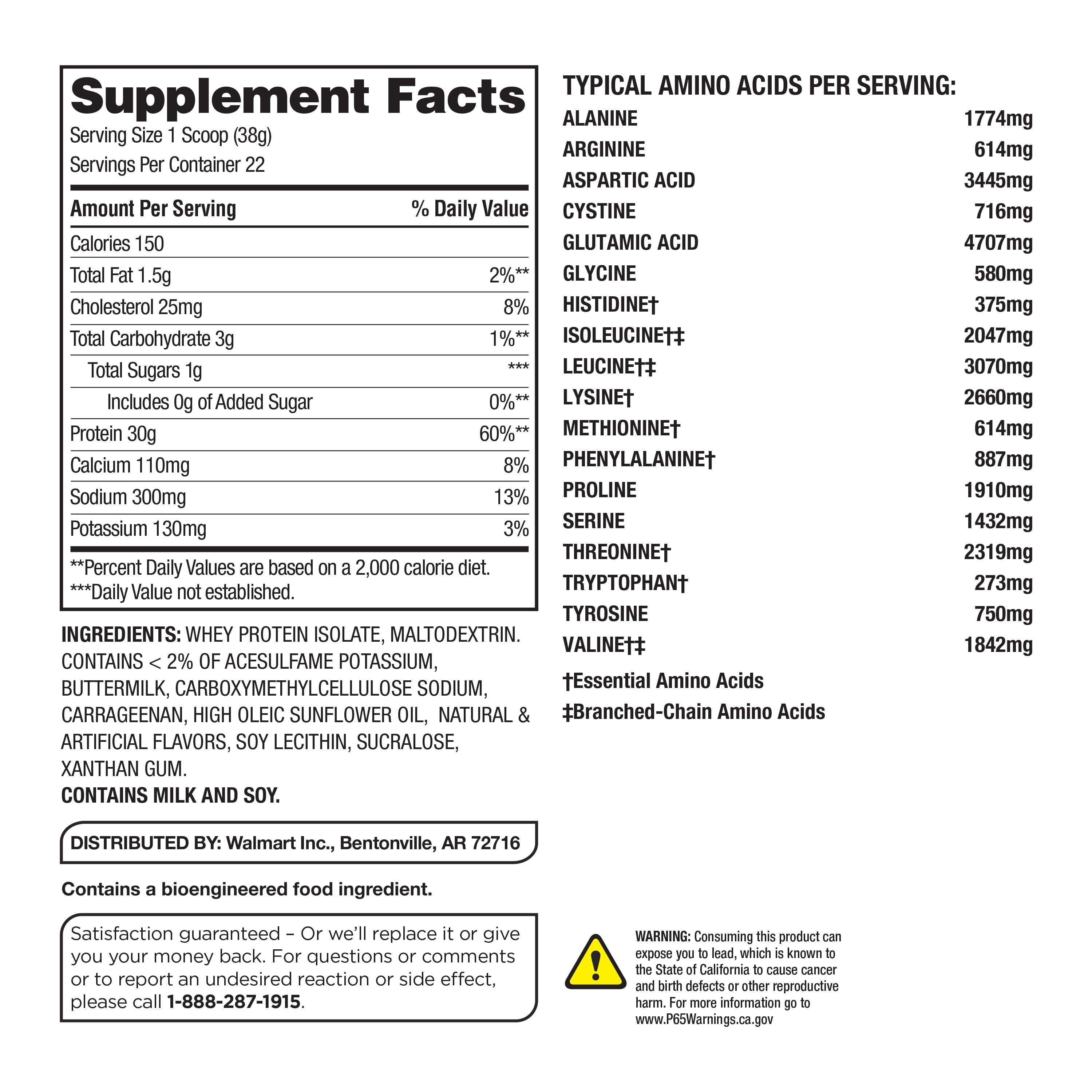 The Equate Isolate Whey Protein Supplement is an easy-to-mix powder formulated to help support lean muscle growth, strength and recovery, and restore energy levels.* This powder delivers 30 grams of protein and 6.9 grams of branched chain amino acids (BCAAs) per serving. The formula has a smooth vanilla flavor and contains no artificial dyes or gluten. Simply add one scoop (38 grams) of the protein powder to eight to 10 ounces of water or your favorite beverage, then stir, blend or shake well, and enjoy! Support energy and enhance muscle recovery with our Equate Isolate Whey Protein Supplement.