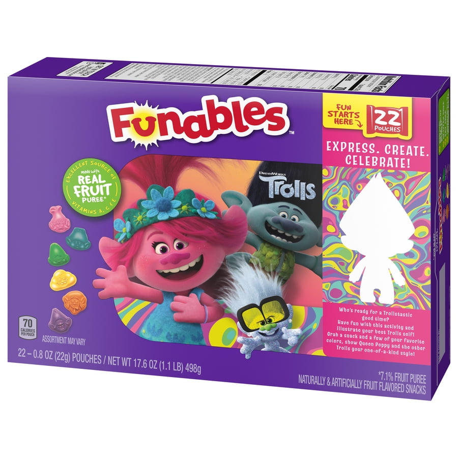 Rock out with your favorite Trolls characters with these delicious fruit snacks! Funables Trolls Fruit Snacks 22 Count include fan-favorite DreamWorks characters. They’re delicious, feel-good treats great for any school lunch box or as an afternoon snack. Conveniently packaged in individually wrapped pouches, it’s a snap to grab a bag on your way out the door, keep a few stashed at your desk, or stock your pantry to share with family and friends.