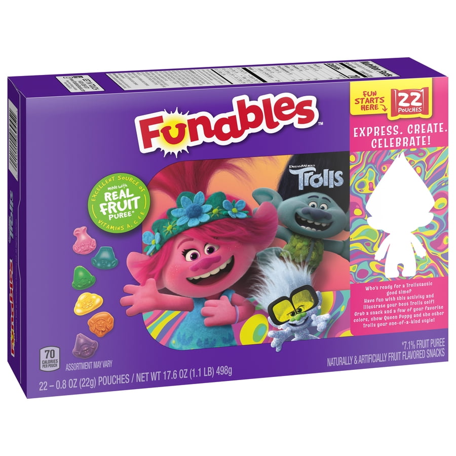 - Lookout! Specially shaped gummy designs in each fruit snack pack represent Trolls characters