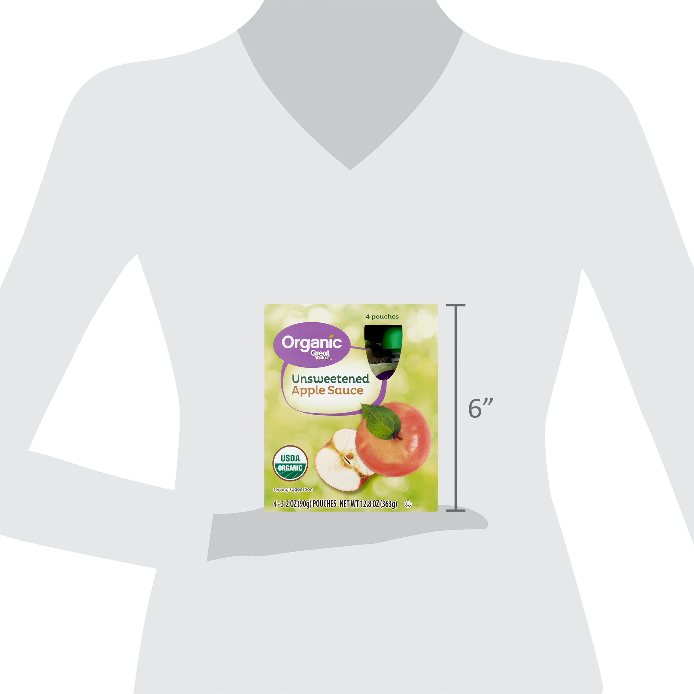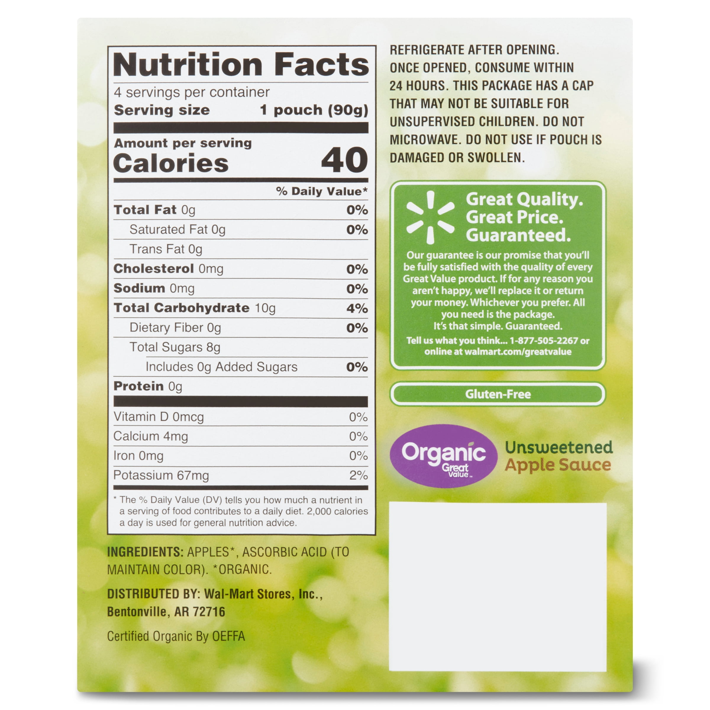 Snack time just got tastier with Great Value Organic Unsweetened Apple Sauce. Our organic apple sauce contains no added sugars, fat, or cholesterol, making it an excellent choice for those pursuing a healthy lifestyle. These 3.2-ounce packages are ideal for school lunches and your on-the-go lifestyle. Add a sweet touch to dinner by topping grilled pork with a few spoonfuls for a sweet and savory combination, create lower-calorie baked goods by replacing butter and oil with apple sauce for moist and delicious treats, or swirl into your oatmeal for a wholesome breakfast. Great Value Organic offers a wide-range of USDA certified organic foods that are hand-selected to meet our high standards as well as yours. We use wholesome ingredients without artificial flavors or preservatives to deliver great food you can trust at an affordable price. Fill your table with organic foods your family deserves without draining your budget.