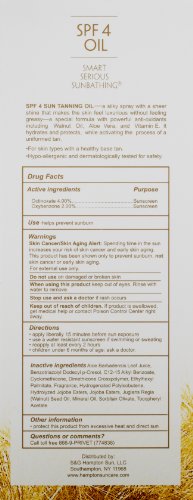 Hampton Sun believes that not only should you protect your skin while in the sun but also return its lost moisture while sunbathing. Indulge your skin with luxurious walnut oil which naturally activates that tanning process to give skin a deep, even, sun-kissed glow. Feel skin become smoothed, moisturized and rejuvenated with aloe vera extracts. Our hydrating SPF 4 Oil absorbs quickly with leaving a silky sheen. This product is hypoallergenic and dermatologist tested so it is perfect for all skin types.Hampton Sun SPF 4 Oil 4 oz