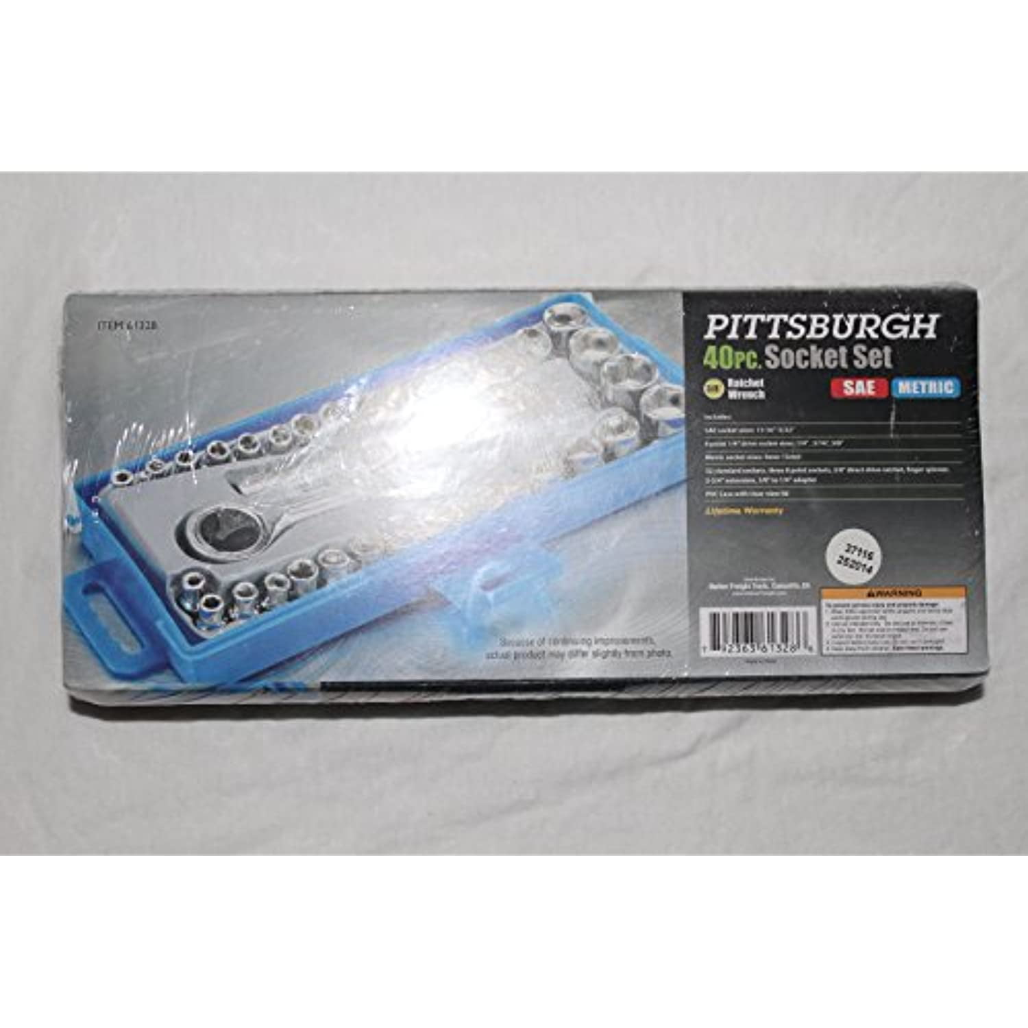 The socket set is constructed of durable steel that works hard against stubborn nuts and bolts. Features include a PVC case with a clear lid that slides easily under car seats for easy compact storage. Includes 32 standard sockets, three 8 point sockets, 3/8 in. direct drive ratchet, finger spinner, 2-3/4 in. extension, 3/8 in. to 1/4 in. adapter and PVC case with clear view lid. SAE socket sizes: 5/32 in. – 11/16 in. 8 point 1/4 in. drive socket sizes: 1/4 in., 5/16 in., 3/8 in. Metric socket sizes: 4mm – 15mm 1/4 in. Drive sockets: 1/4 in., 5/16 in., 3/8 in.; SAE: 5/32 in., 3/16 in., 7/32 in., 1/4 in., 9/32 in., 5/16 in., 11/32 in., 3/8 in., 13/32 in., 7/16 in., 15/32 in., 1/2 in., 17/32 in., 9/16 in., 5/8 in., 11/16 in.; Metric: 4mm, 4.5mm, 5.0mm, 5.5mm, 6mm, 6.5mm, 7mm, 7.5mm, 8mm, 9mm, 10mm, 11mm, 12mm, 13mm, 14mm, 15mmHarbor Freight Pittsburgh 40 pc SAE/Metric Socket Set