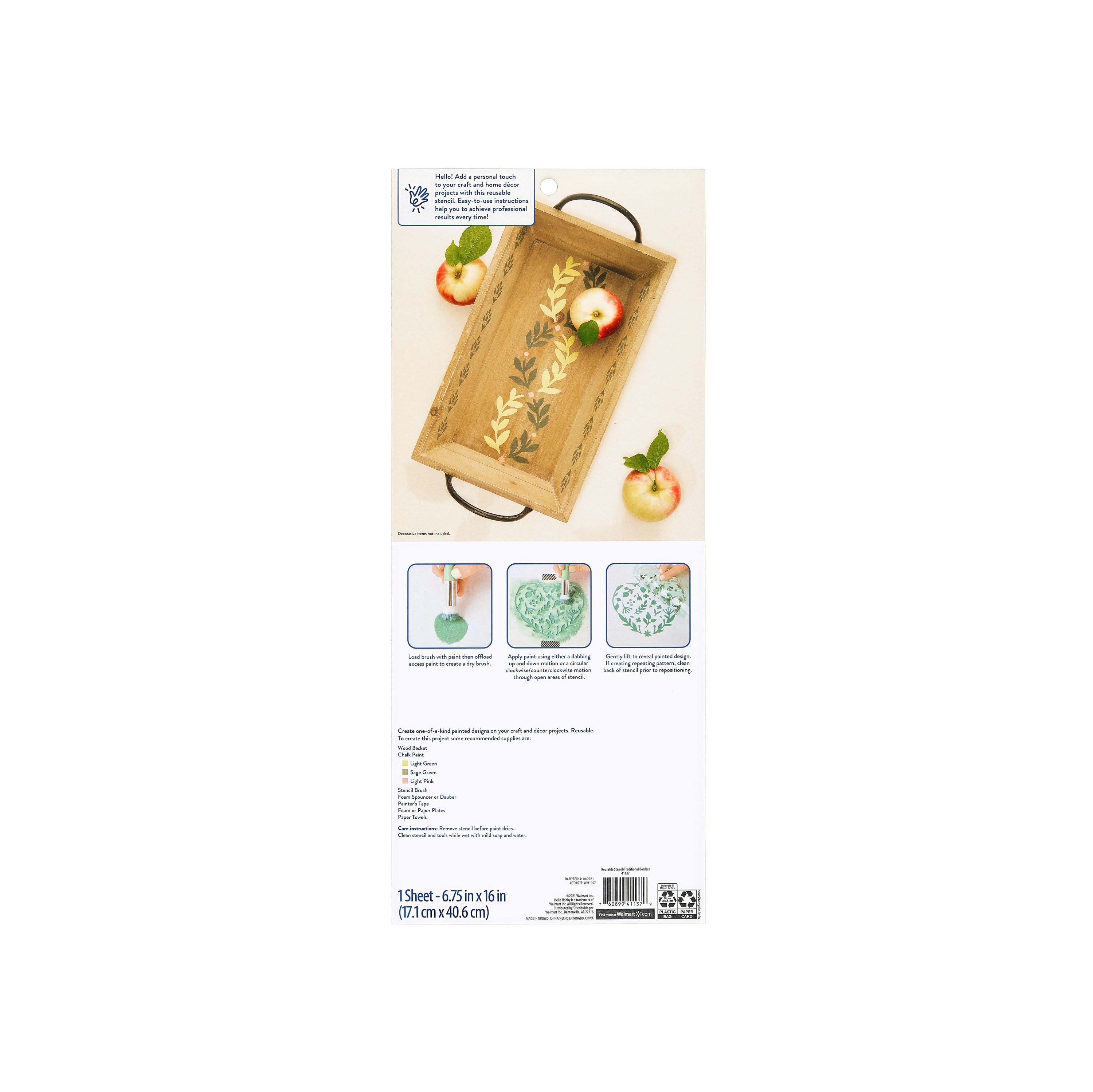 Use these Hello Hobby large Stencils to create signs and add design elements to all kinds of surfaces. Position and use tape to hold these PET stencils in place. Apply paint sparingly with a stencil brush or foam dauber sponge. Remove carefully and allow to dry. For easy clean up, wash the paint off the stencil with mild soap and water while it’s still wet so you can reuse it. This pack includes one large sheet, 6. 75” x 16” sheets, with designs created for larger surface areas.
