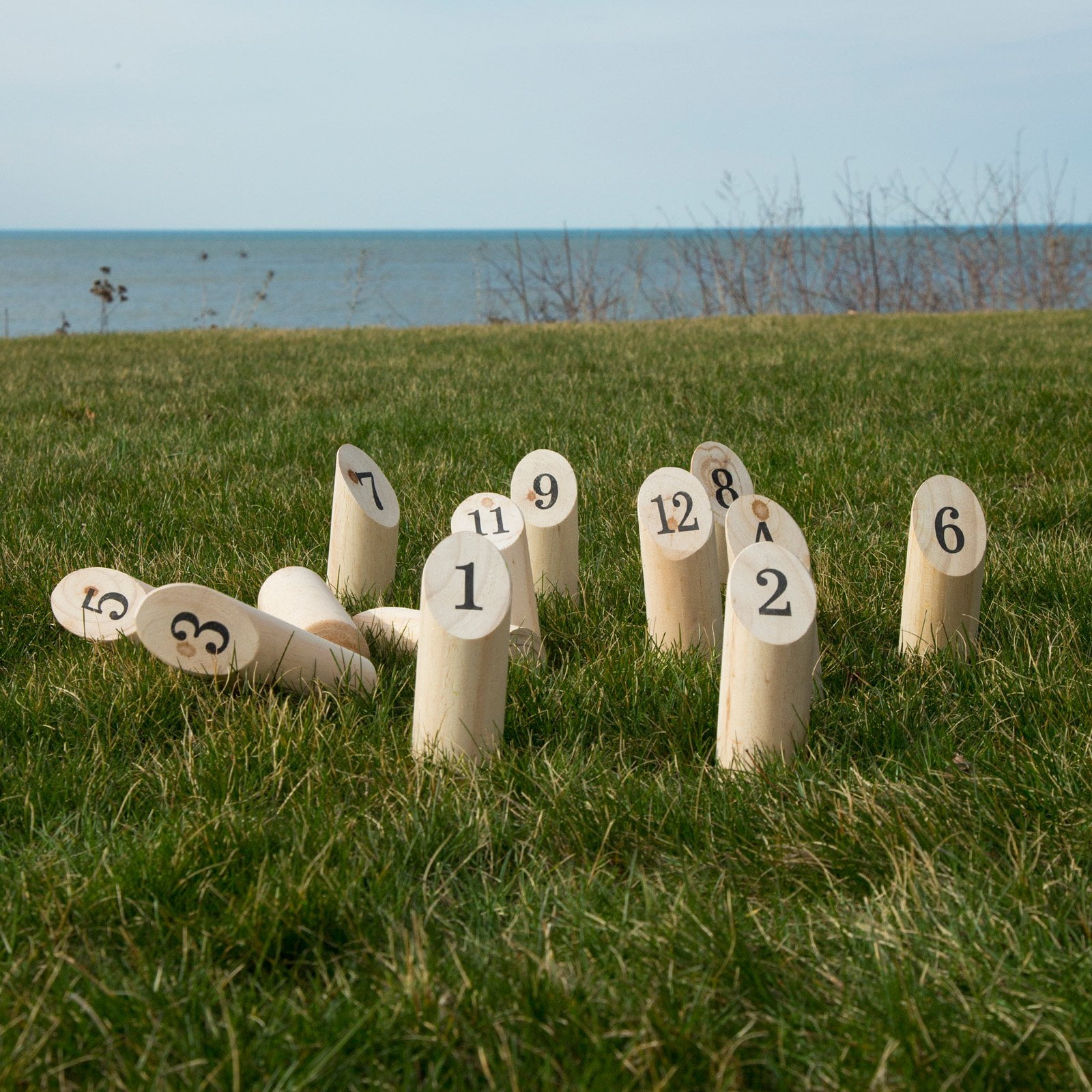 - Features wooden dowel and 12 numbered pins