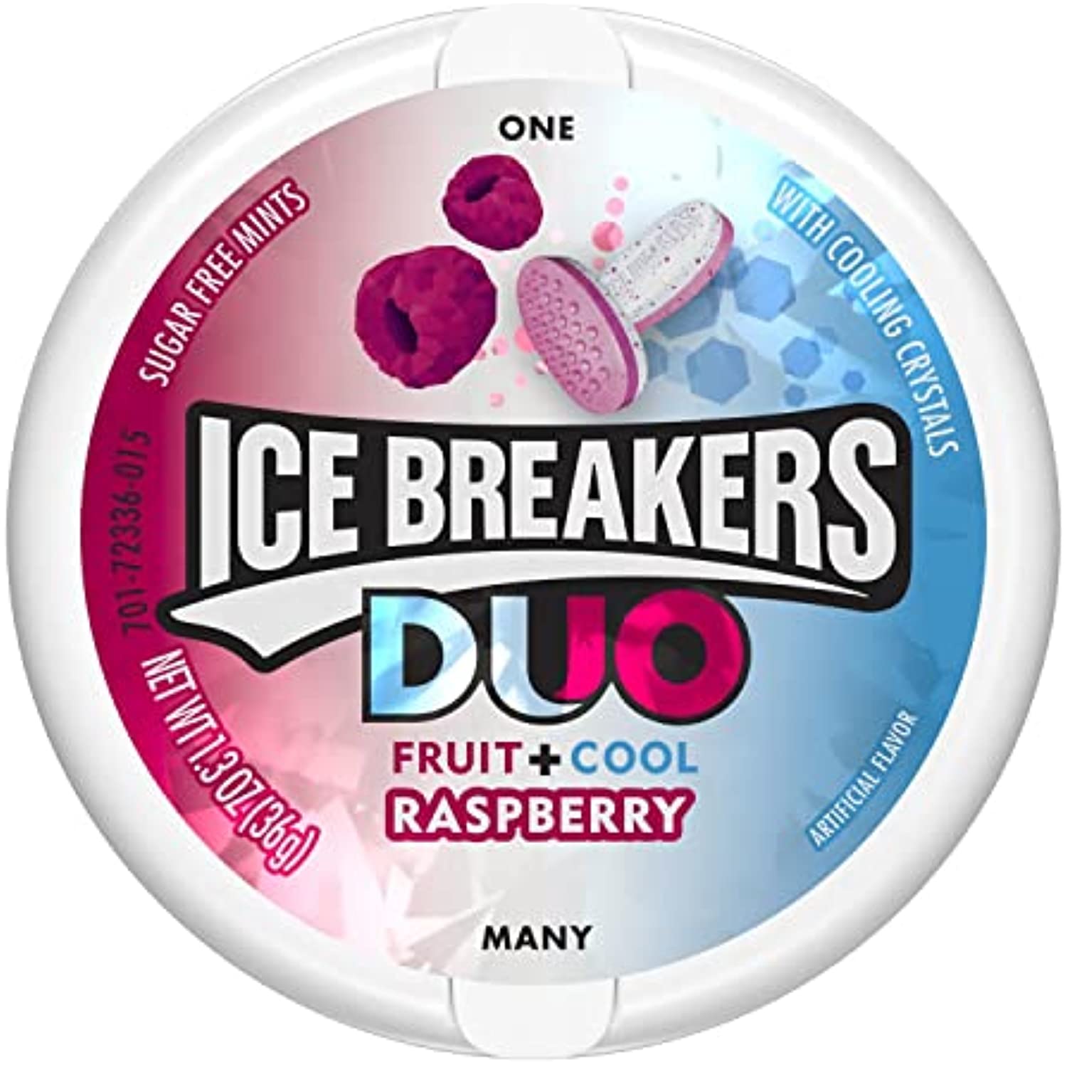- Cool, raspberry-flavored ICE BREAKERS DUO mints are packaged in a mint tin you can take with you anywhere for all-day access