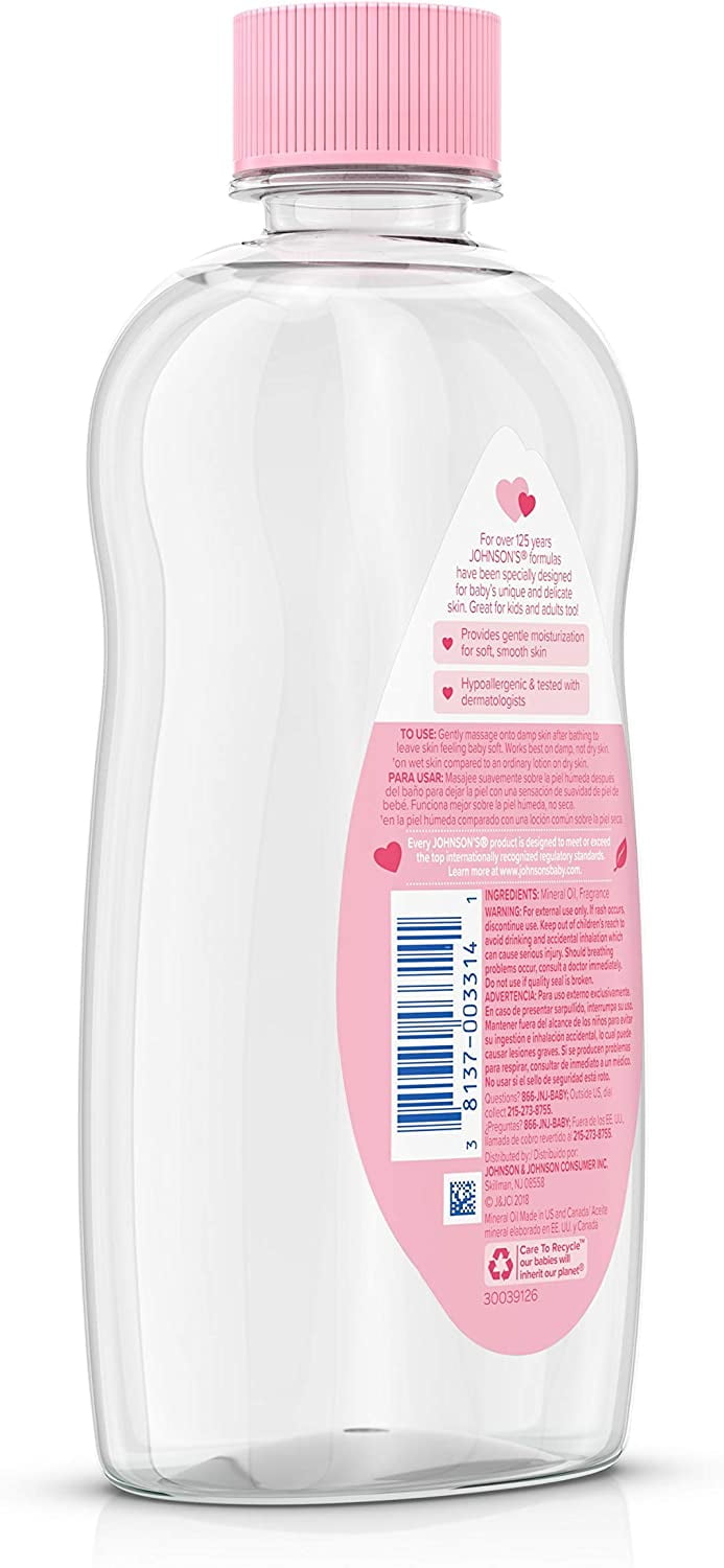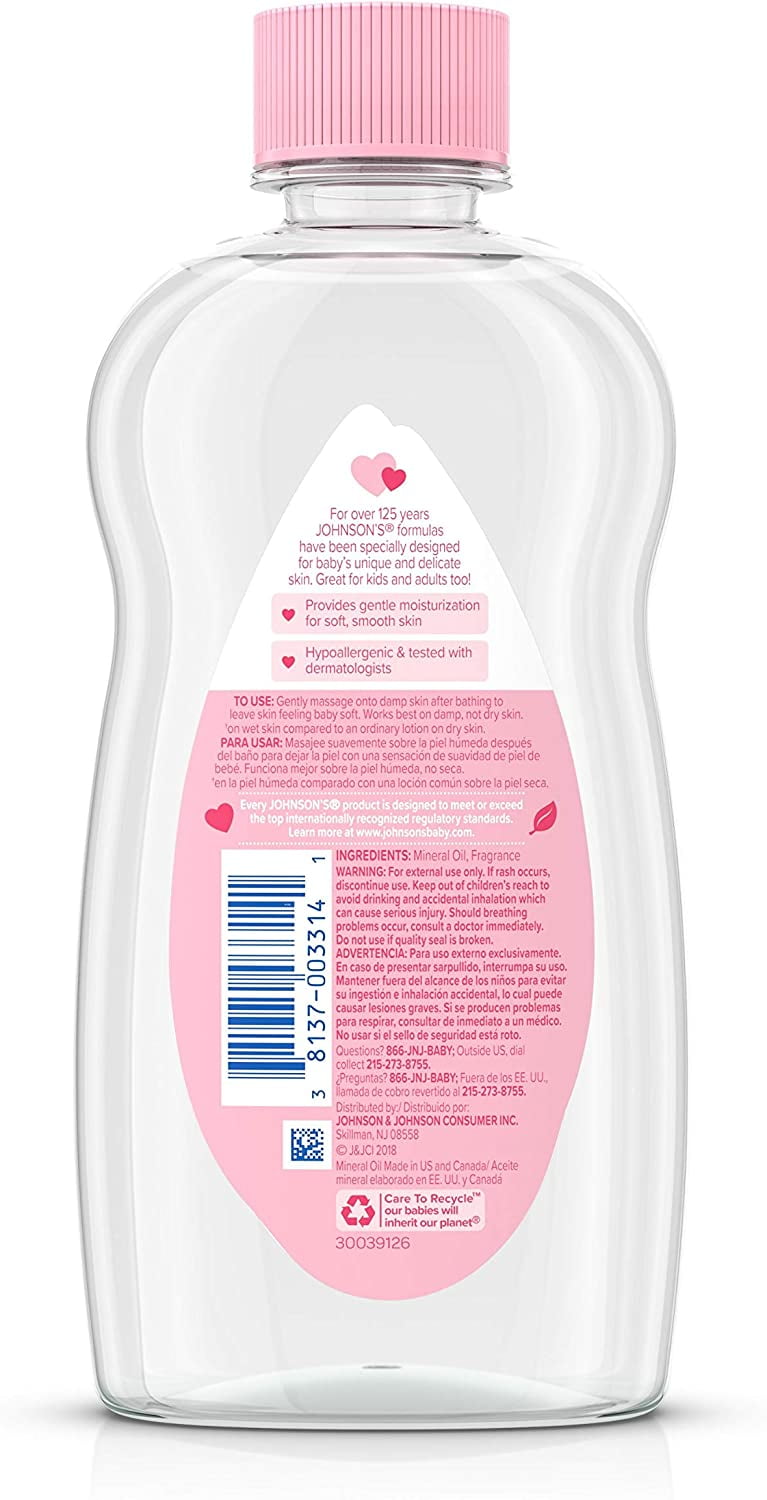 JOHNSON’S. Trusted since 1885.Baby OilJ & JActive Ingredients:Mineral Oil; FragranceFOR BABY: Use daily to help protect skin from dryness and seal in moisture. FOR YOU: Step out of the shower or bath, then apply on wet skin to lock in moisture and leave skin feeling soft and smooth. Pat dry with towel.Uses:JOHNSON’S Baby Oil is made with pure mineral oil to form a silky barrier to prevent excess moisture loss. This fast absorbing dermatologist and allergy tested baby oil helps soften and protect baby’s delicate skin. JOHNSON’S Baby Oil locks in up to 10 times more moisture on wet skin than an ordinary lotion can on dry skin. SAFETY TIP: To avoid slipping, do not apply while in shower or bath. For external use only. Do not apply to irritated skin. If rash occurs, discontinue use. Keep out of children’s reach to avoid drinking and accidental inhalation which can cause serious injury. Should breathing problems occur, consult a doctor immediately.