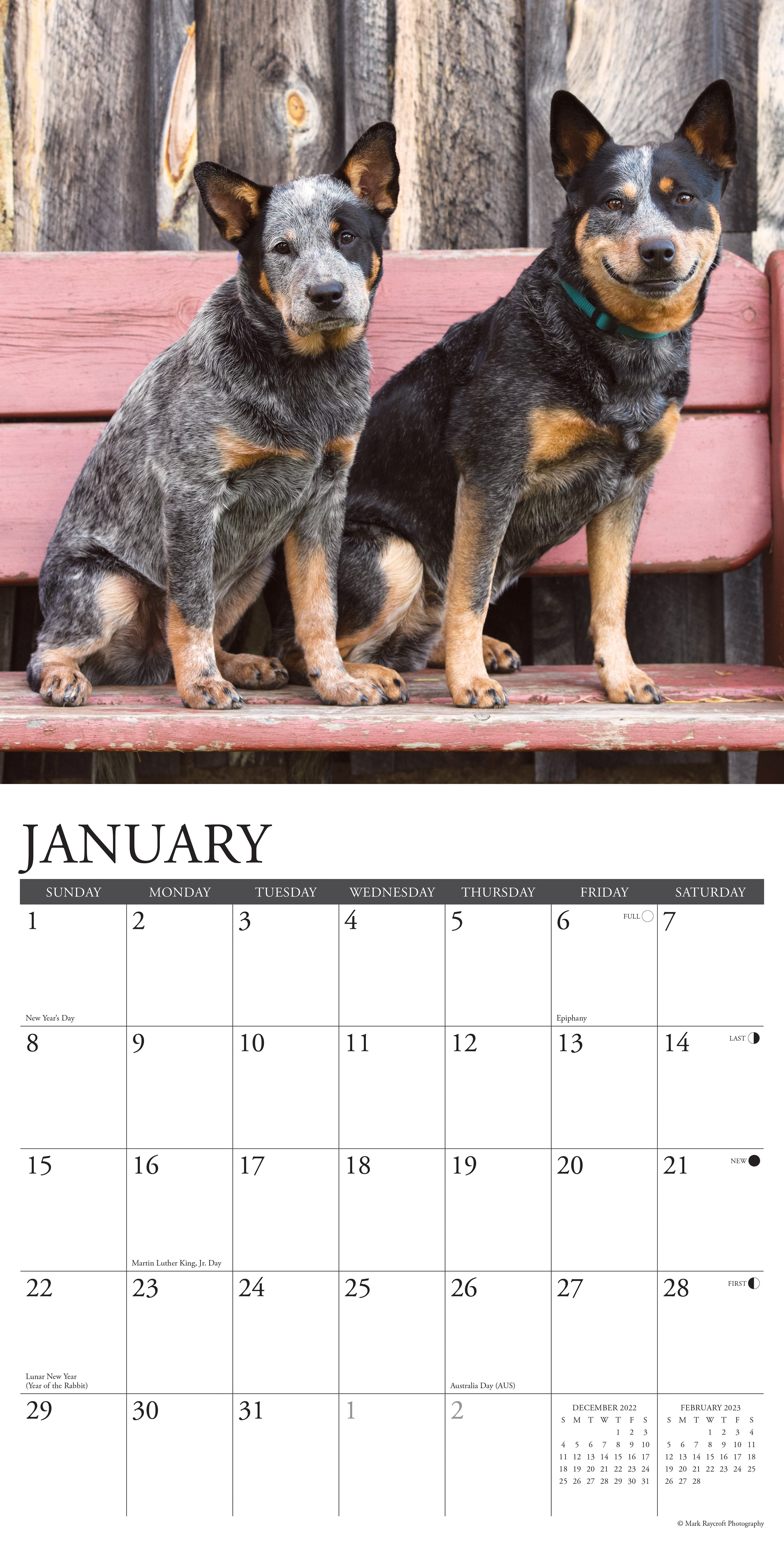 Related to Australia’s wild dog, the Dingo, Blue Heelers are known for being resilient herders full of intelligence, stamina, and grit. Specifically bred for Australia’s challenging beef ranch conditions, this hearty breed is known by its unique blue mottled or speckled coat. Printed with soy-based inks on FSC certified paper, this 12" x 12" wall calendar features large monthly grids that offer ample room for jotting notes, along with six bonus months of July through December of 2022. Also includes moon phases (CST), standard U.S. and international holidays.