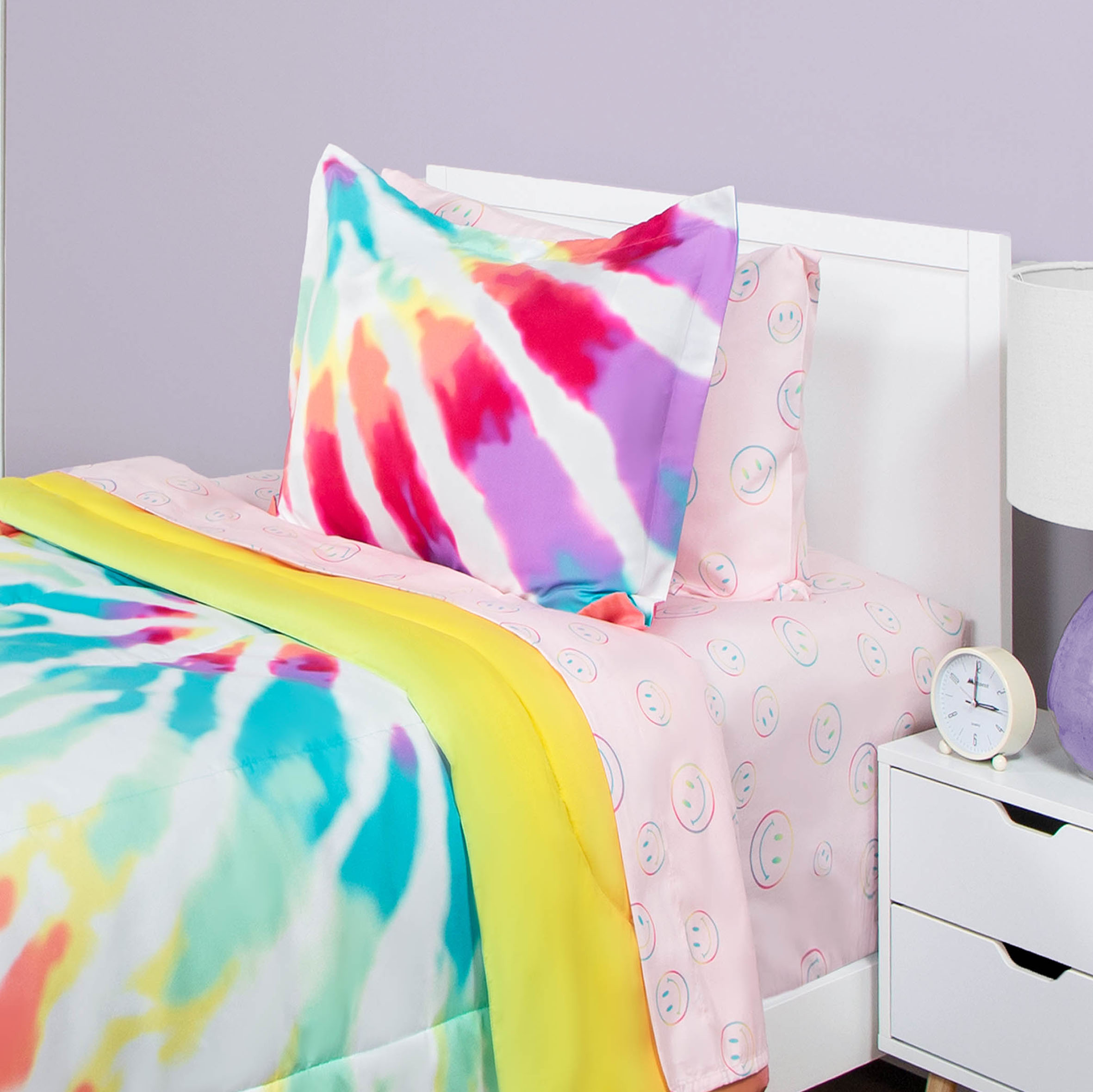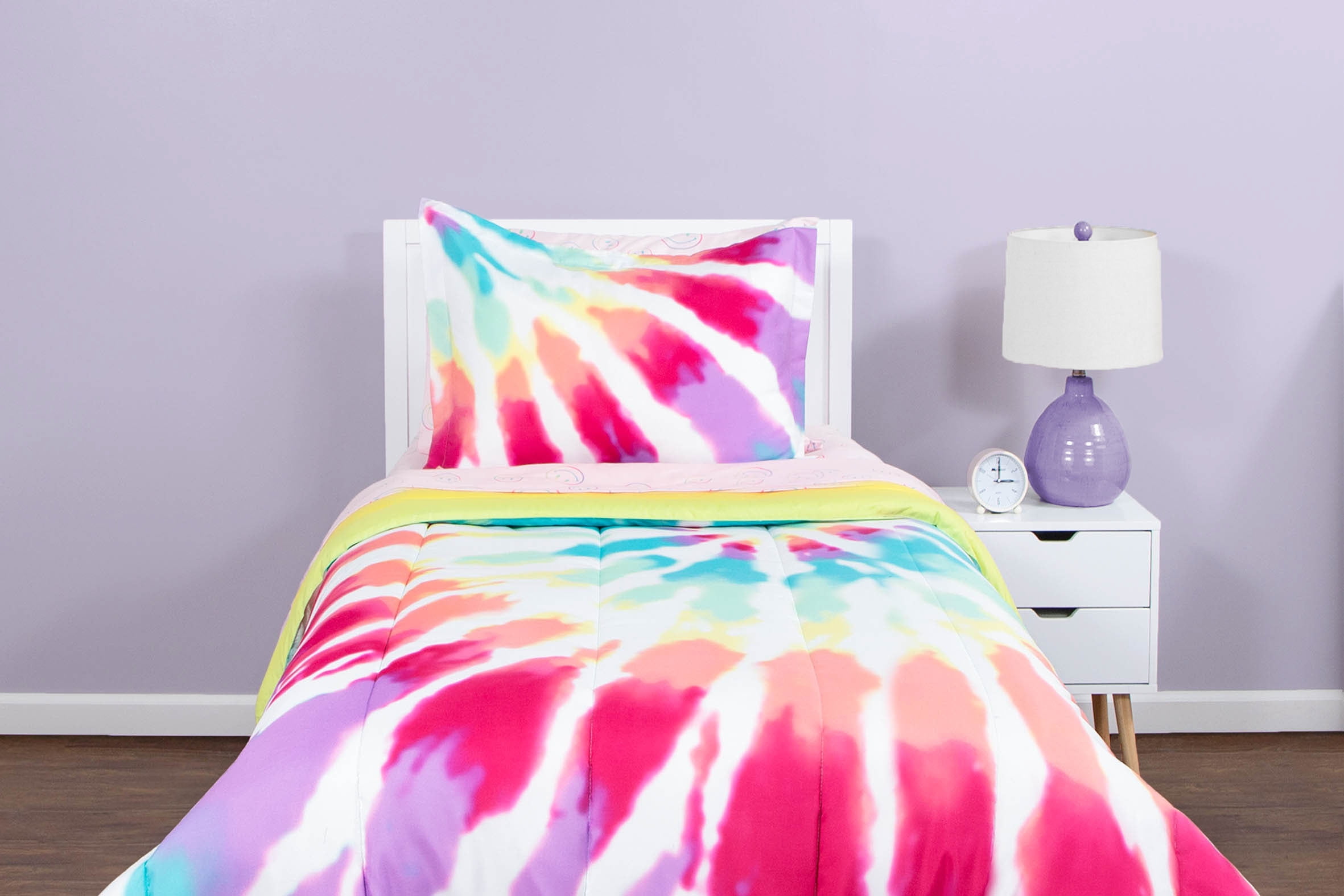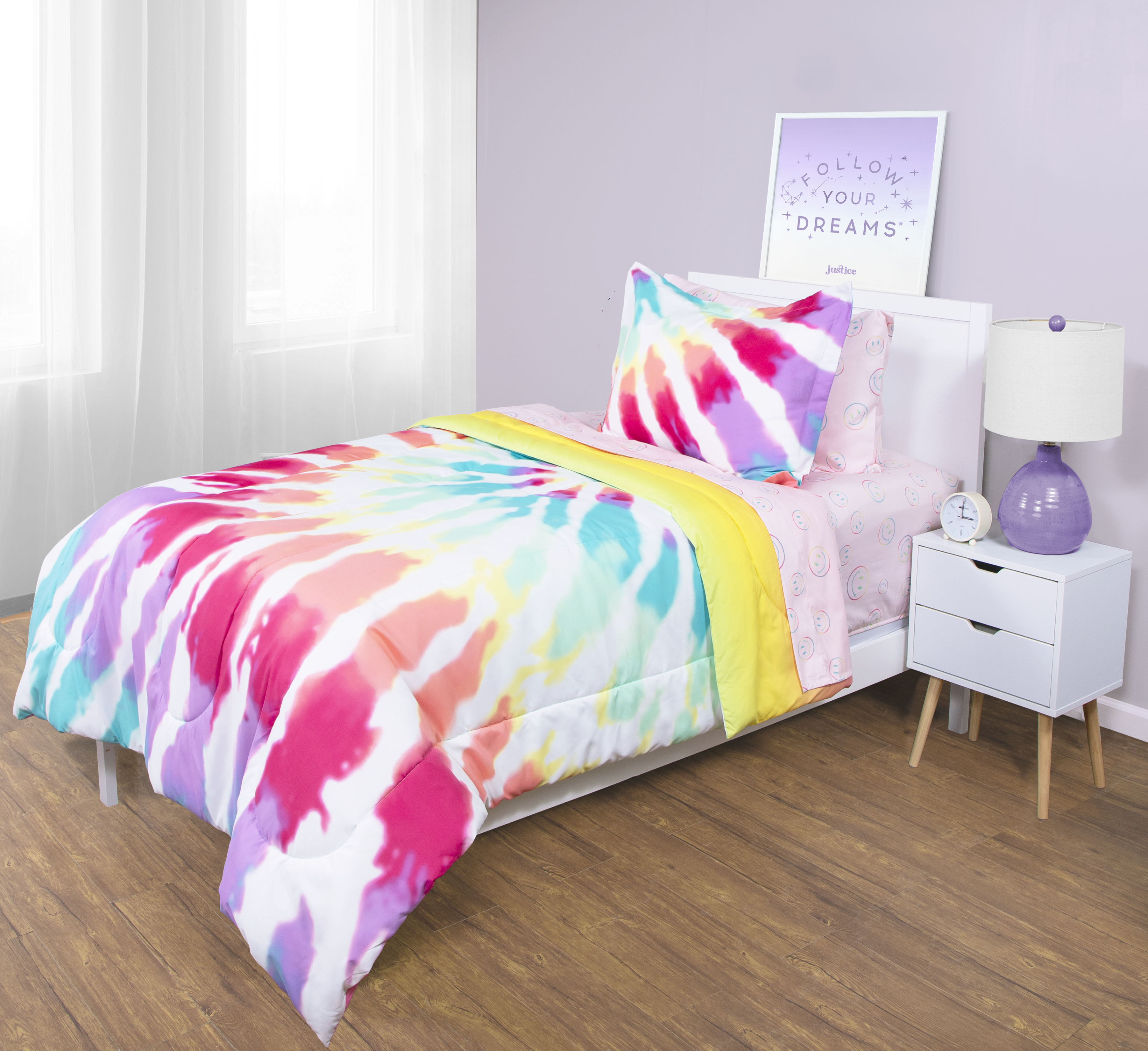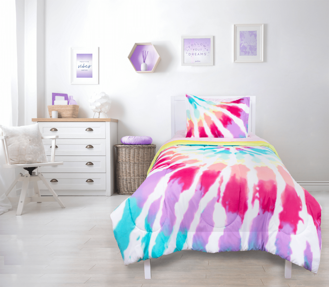 Give your room a makeover with this adorable Justice Pink Tie Dye Twin Comforter and Sham Set. The set is made from super soft microfiber fabric and is the perfect year-round weight. For easy care, simply machine wash on cold and tumble dry low. The set is reversible to let you change up your look. Shop the rest of our Justice tween bedding and home collection, including matching decorative pillow and sheet set, exclusively on Walmart.com!