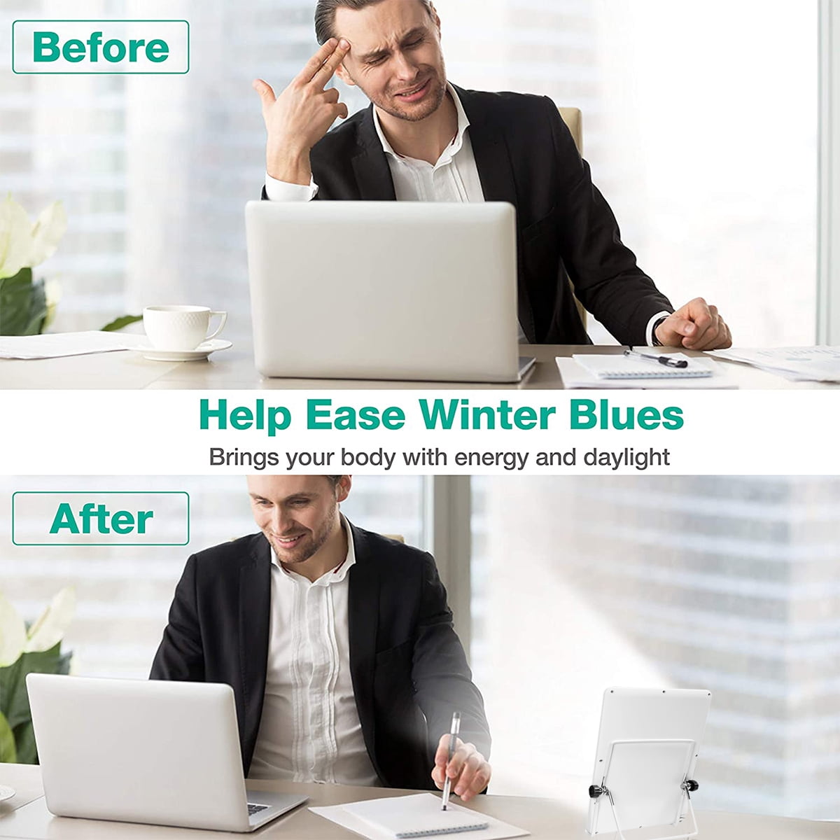 - LED, uv-free, full-spectrum, 6000-32000 lux light treatment lamp: this product has the same color temperature of 6500K and 6000-32000 lux, which can help users eliminate the effects of winter blues, time difference, shift work or seasonal changes