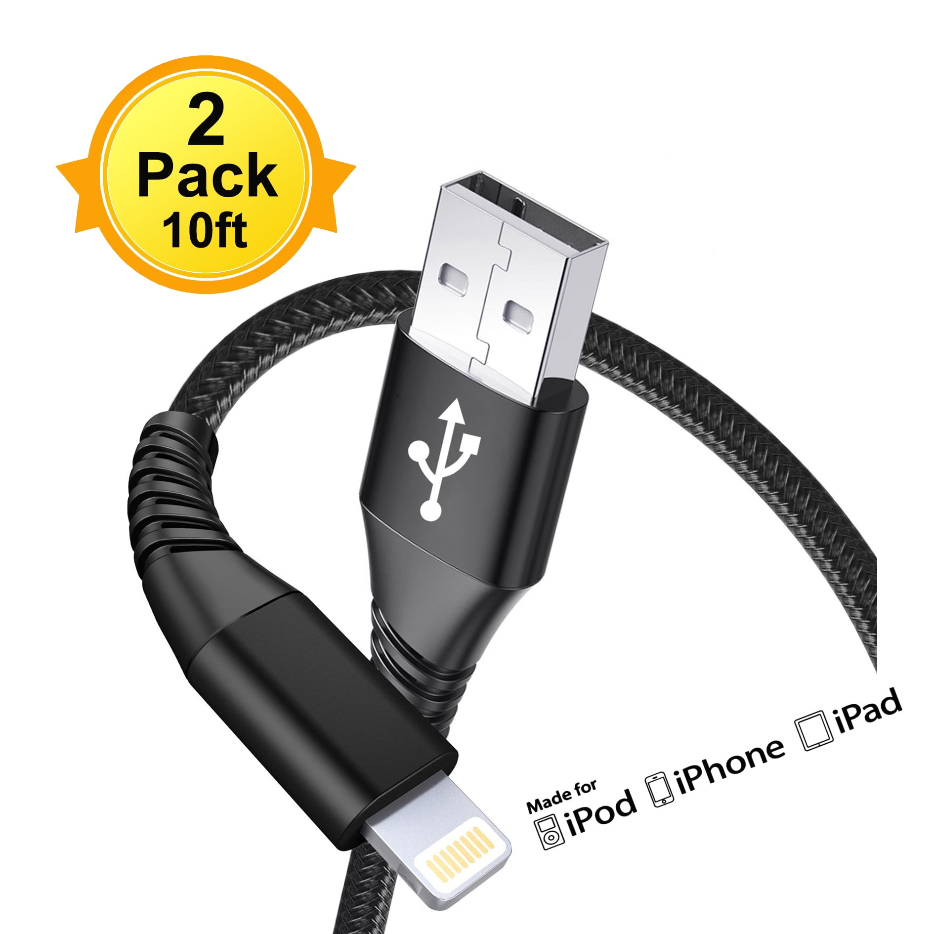 Lightning Cable 10ft 2Pack, XUDUO iPhone Charger Cord Nylon Braided Fast Charging USB Cord for iPhone11/X/XS/XR/8/7/6/5S/SE/iPad Mini Air(Black)
