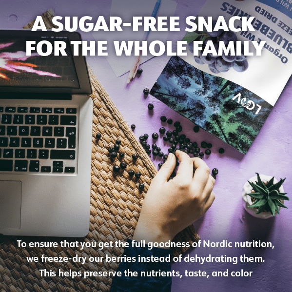 By enjoying dried, unsweetened wild blueberries (V. myrtillus), you get the berries of Finnish forests in a simple 4 Ounces New packet! Nordic Wild Blueberry contains antioxidants 3-5 times higher than cultivated blueberries. Finland has the highest number of organic forest berry areas in the world. Mid-summer, there are 19 hours of daylight in southern Finland, and in the northern Arctic Circle region, it never gets dark. This abundance of light causes the formation of antioxidant compounds. Wild blueberries that grow wild in the forests develop exceedingly high levels of antioxidants. Freeze-dried to guarantee the best nutrients for you. No added sugar, no added oil. Eat as a snack or add to smoothies, yogurt, juice, porridge, cereal, or muesli, or use in other recipes (e.g., blueberry muffins, trail mixes, etc.). Store in a dry dark place at room temperature. Eat within 60 days of opening. Tip: Make sure the packaging is sealed and airtight after opening to keep the berries from clumping and to preserve the quality of nutrients.