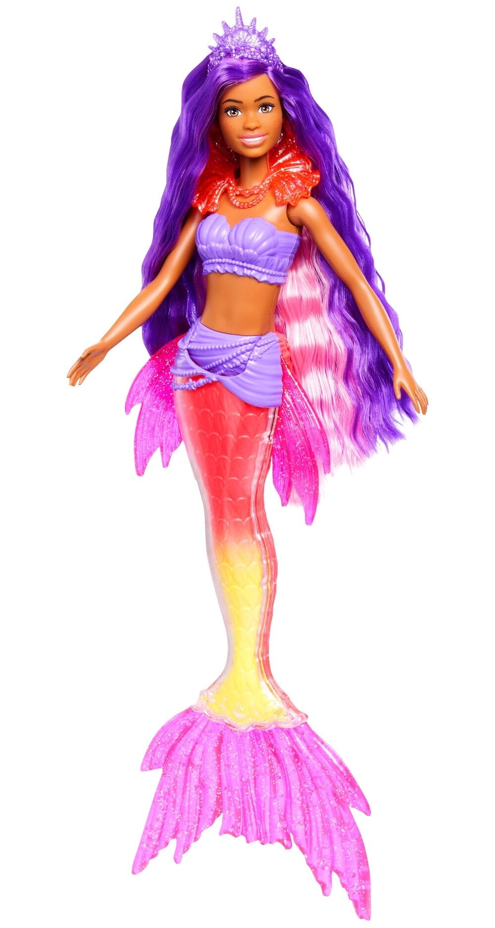 - Barbie doll features a magical mermaid look, complete with extra-long purple hair and a beautiful ombre tail with premium touches and sculpted scales